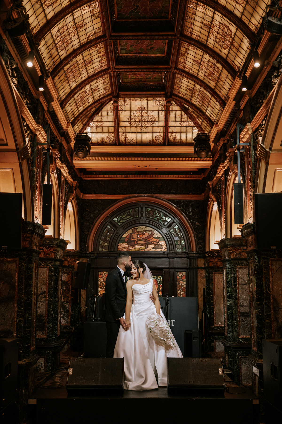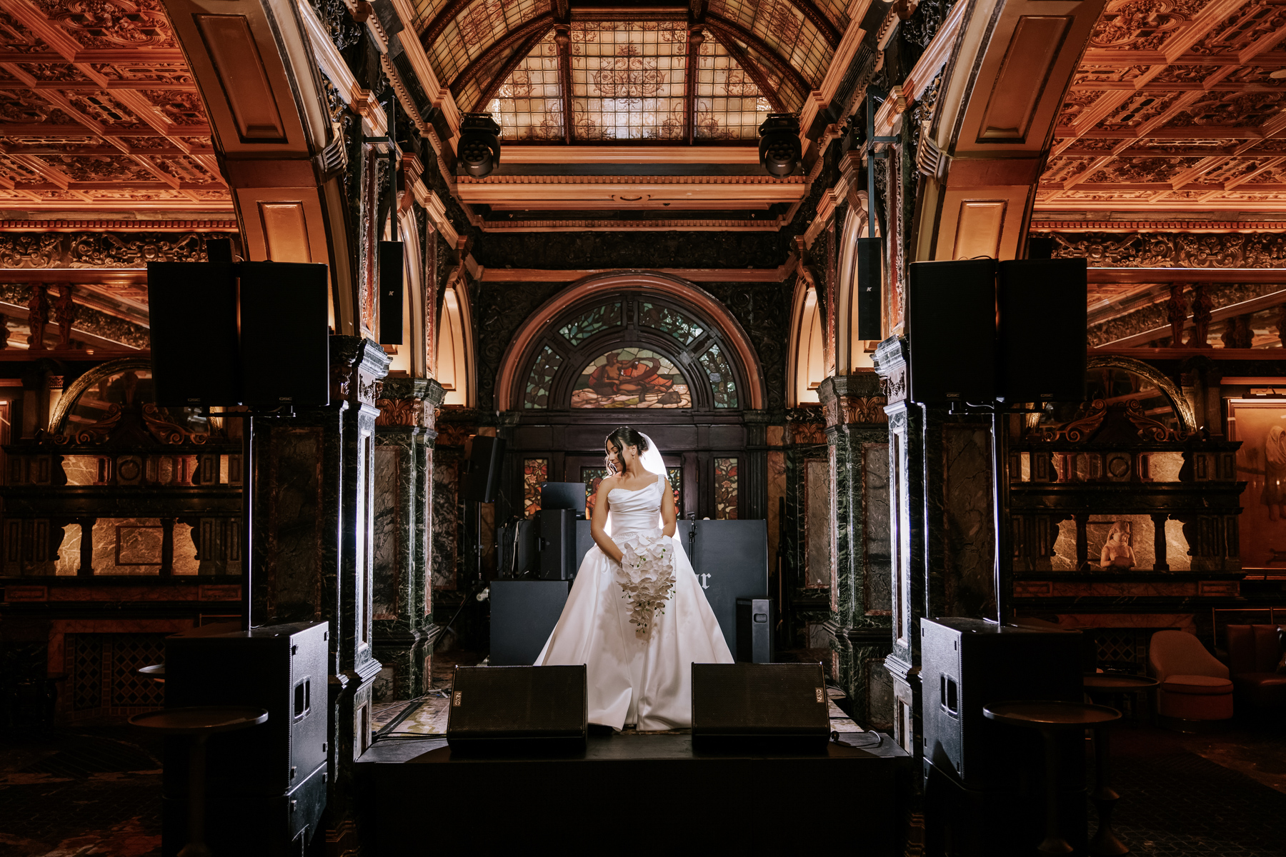 A quiet moment with the bride amid the sound and lights, before the sound and lights go on. There are so many great backgrounds in this venue, with that stained glass and warm golden lighting. We like how the black equipment looks like shadows.
