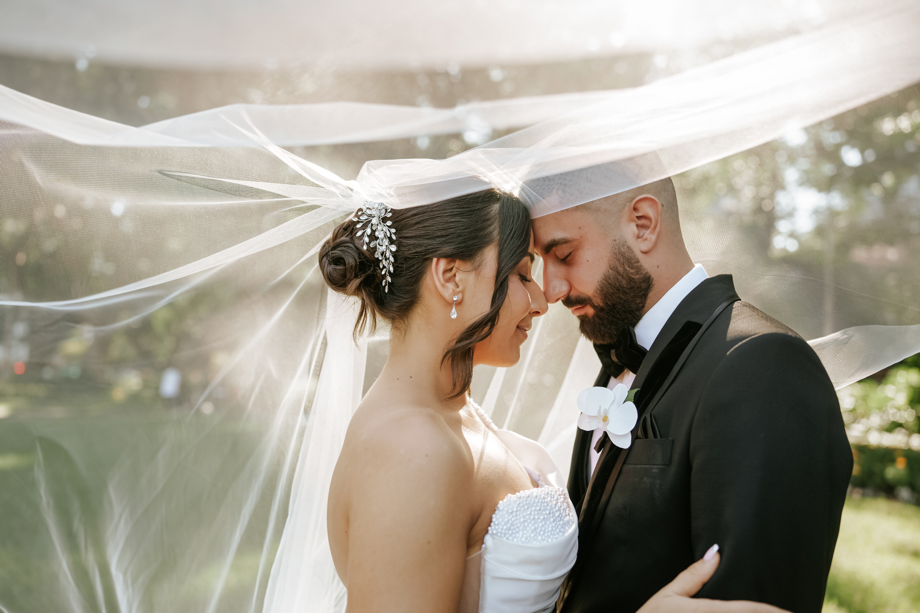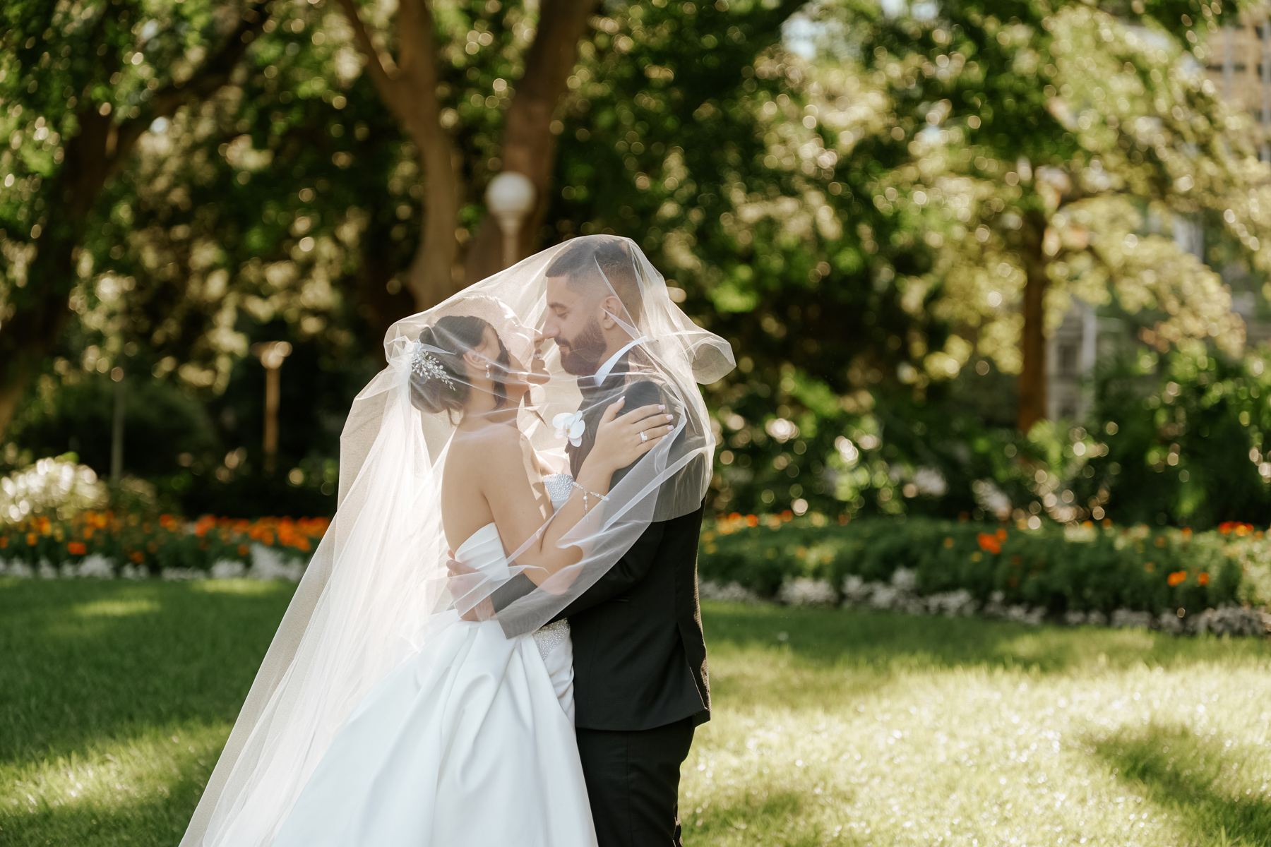 Bride and groom behind a veil, being both private and public, intimate and open.