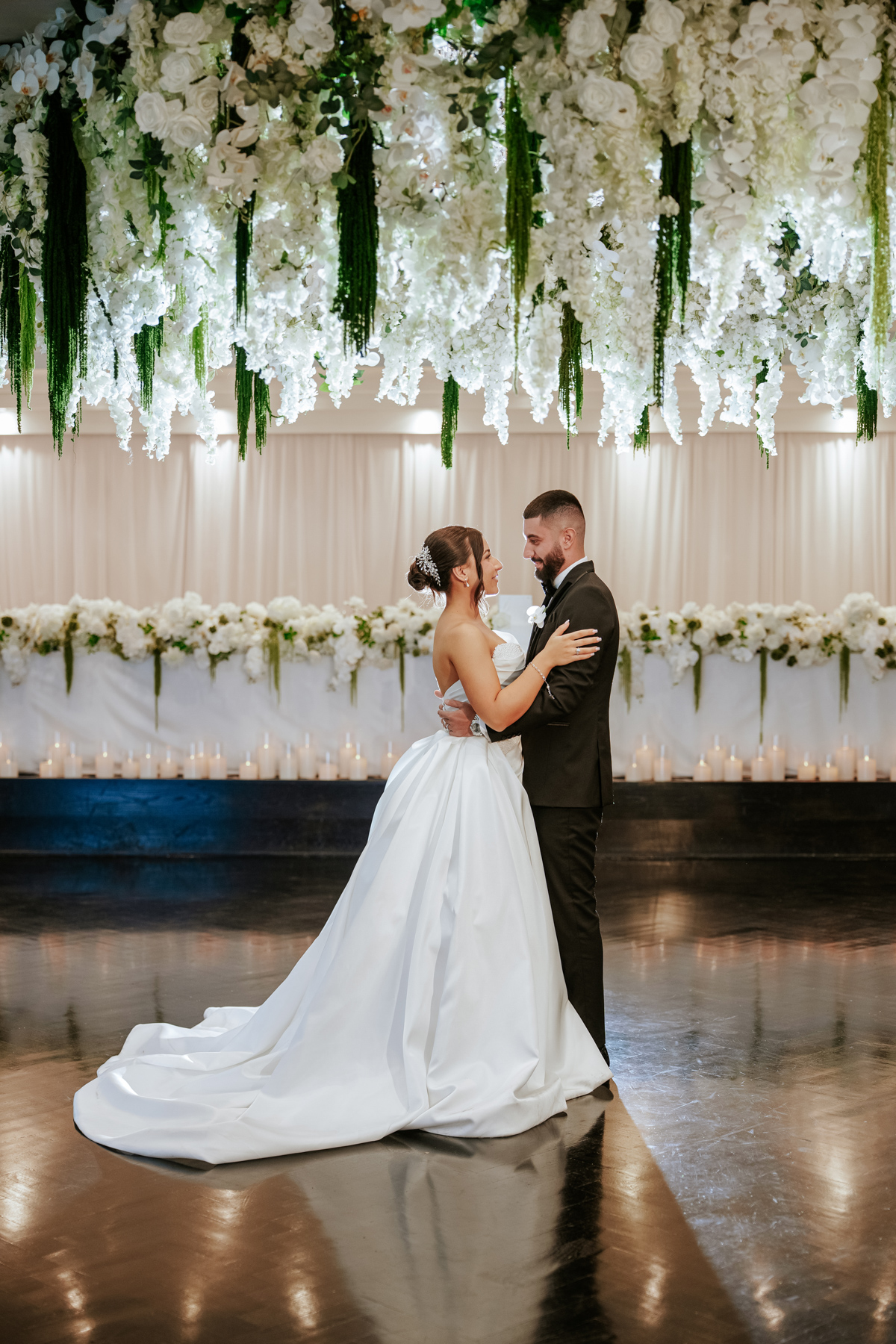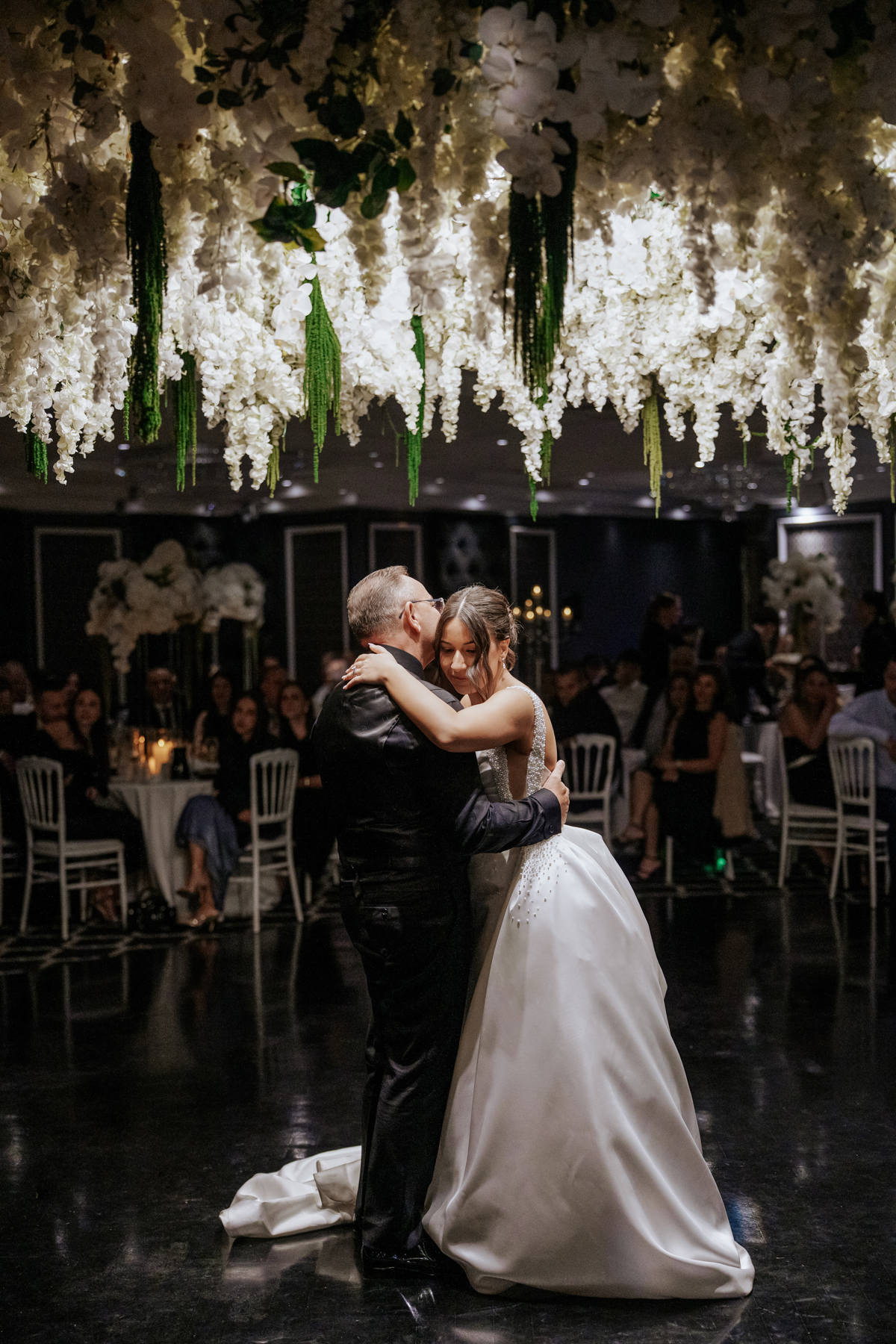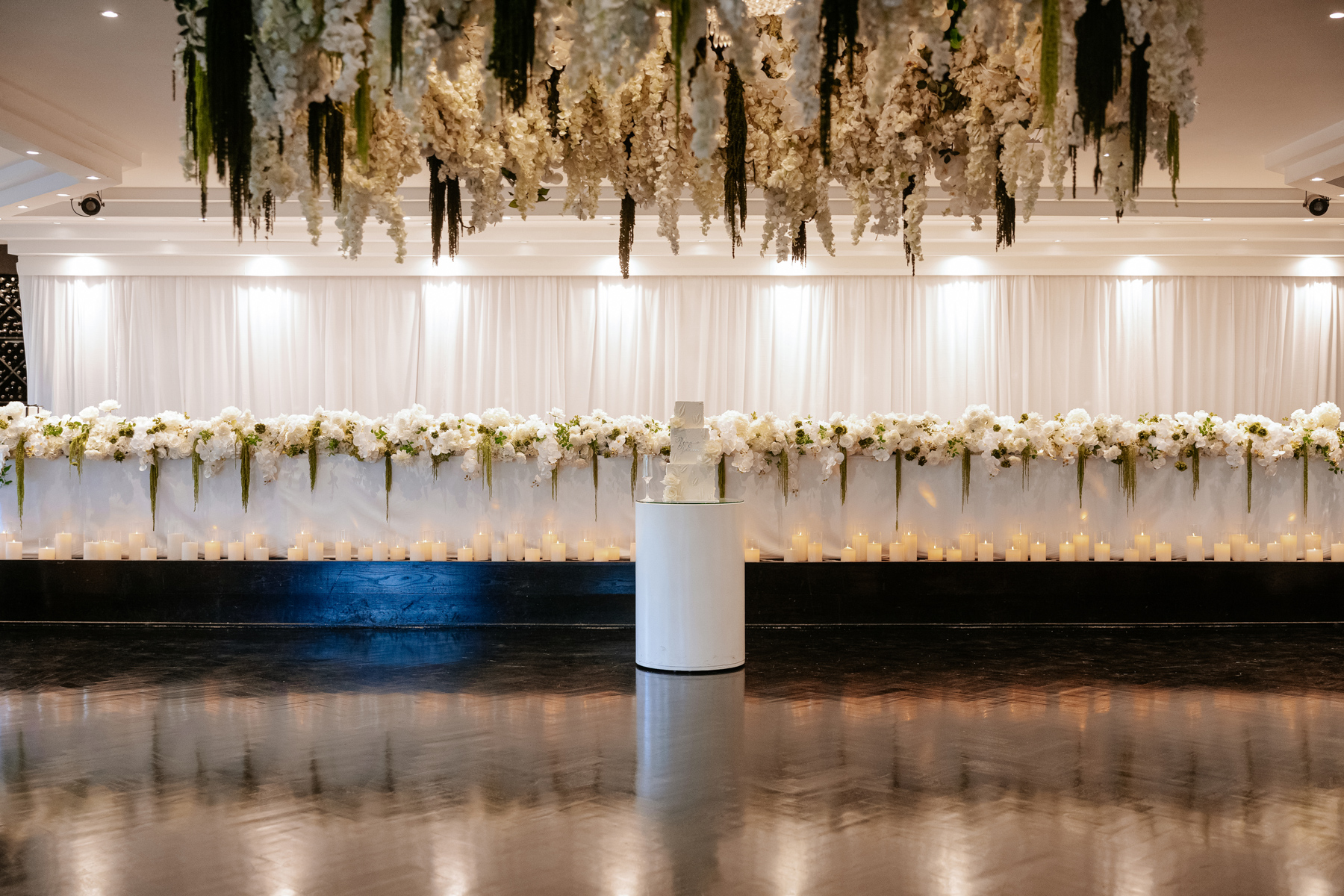 Inside the Chateau Reale Lounge at Doltone House, Sylvania Waters for the reception. Those flower arrangements on the ceiling and head table were incredible.