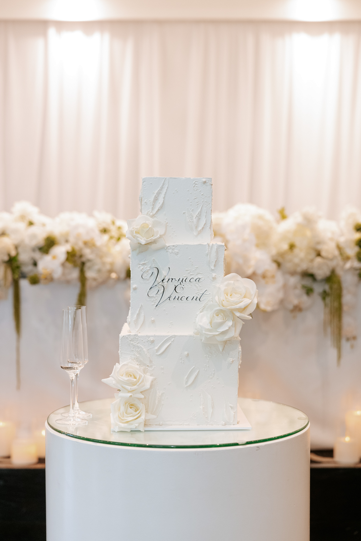 One of the essential wedding photos that we look forward to – the cake. There are so many variations on white, and this has an especially nice texture.