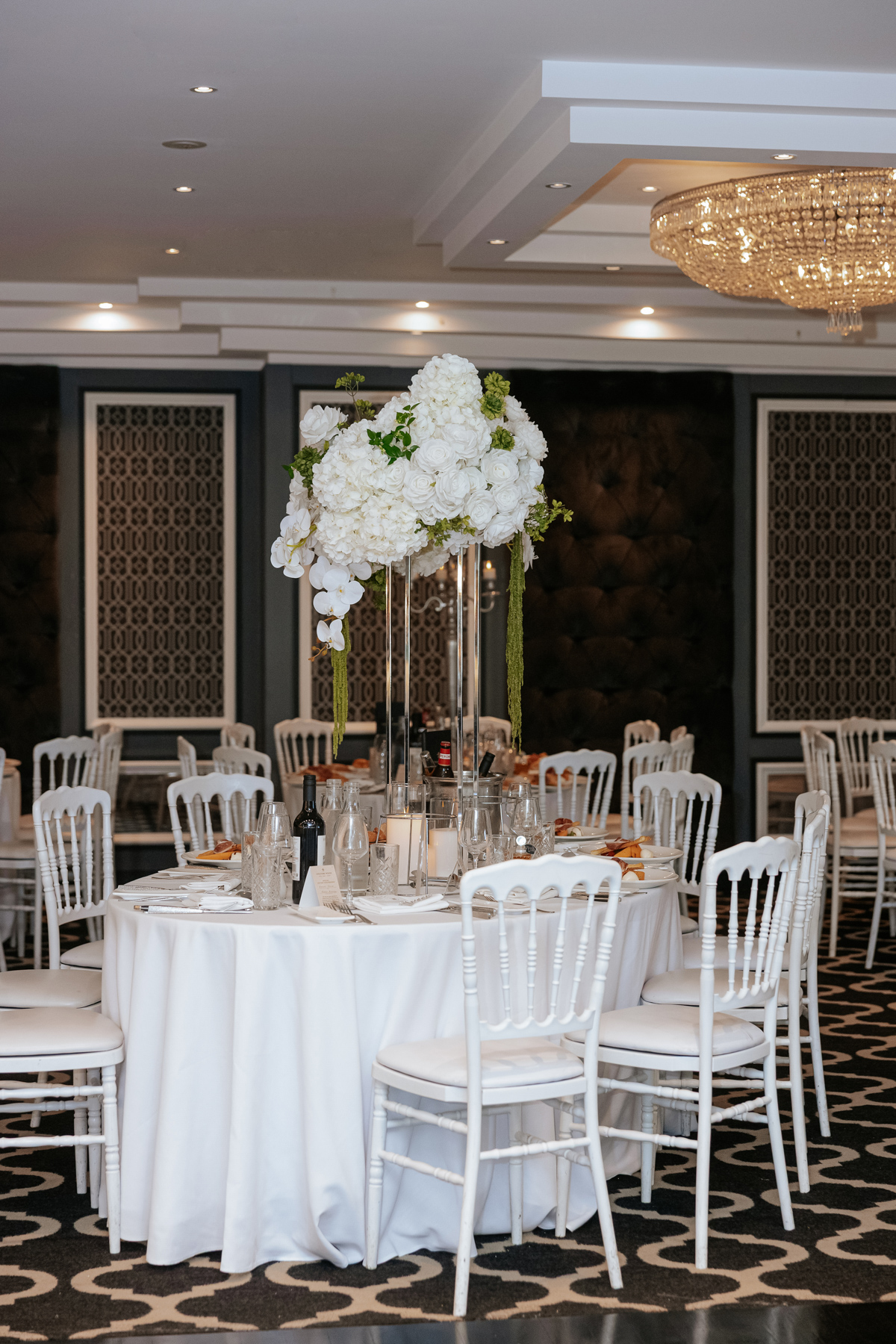 The dining arrangements are the type of detail that the wedding guests tend to remember. Very impressive settings in the Chateau Reale Lounge, with more of those white flower arrangements.