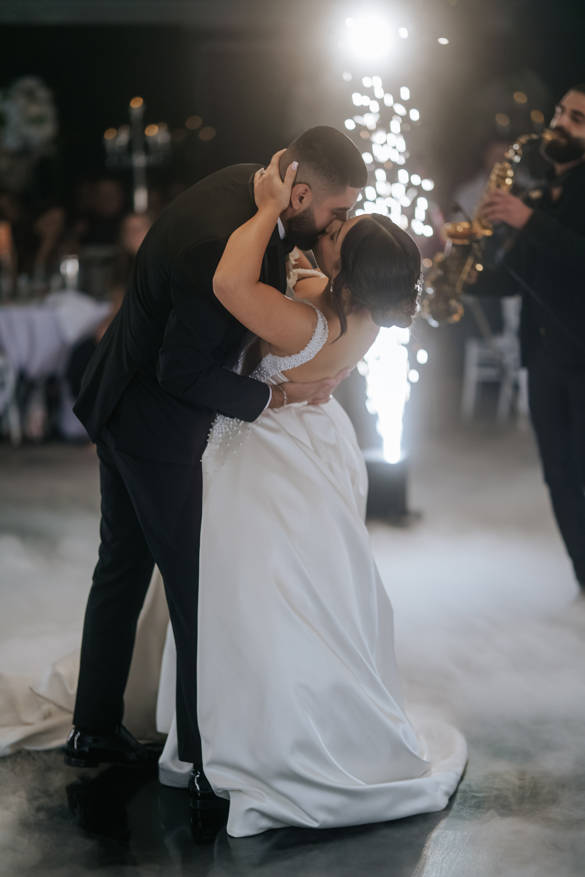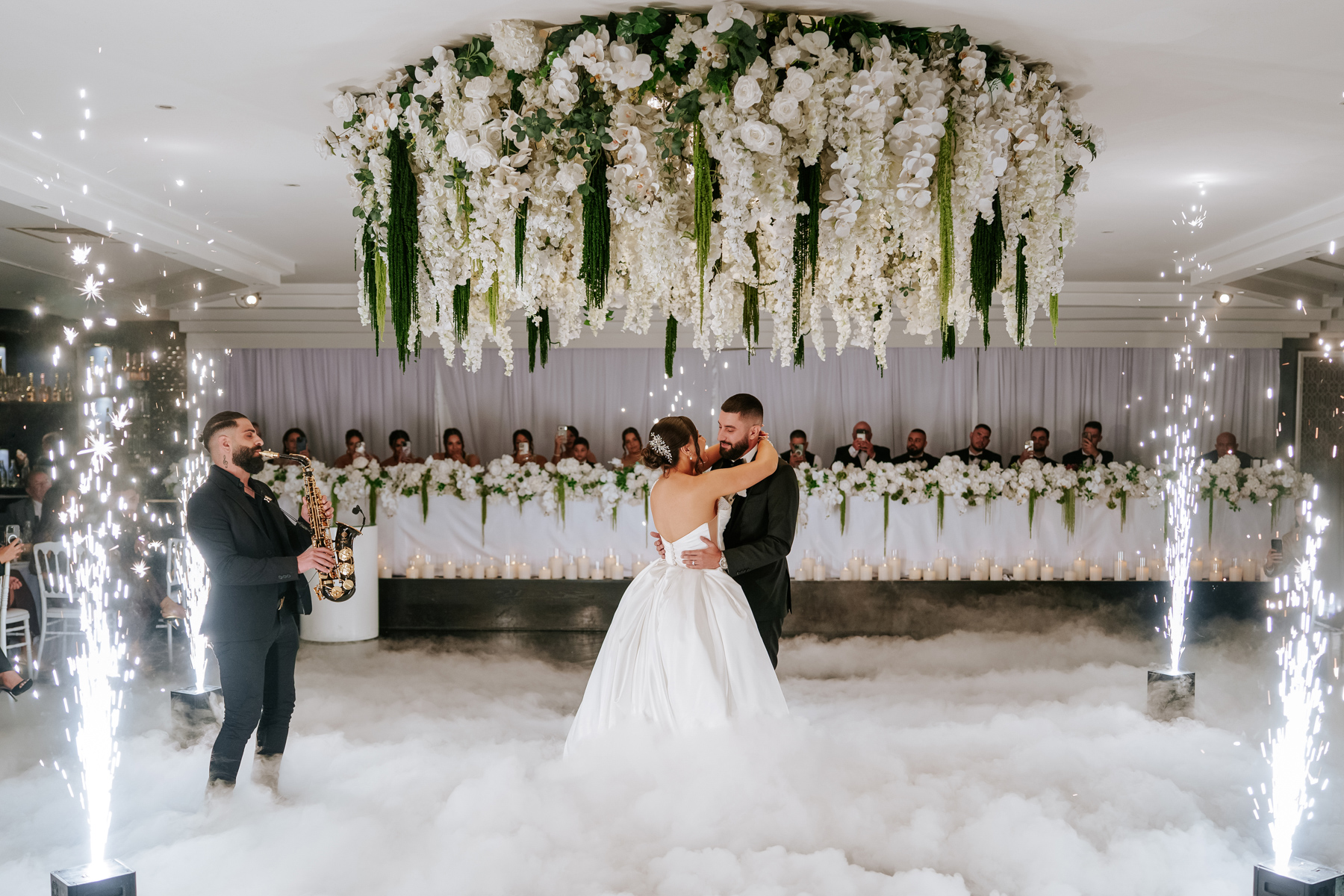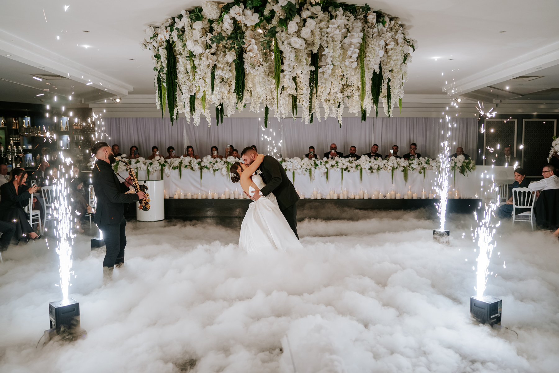 Dancing still amid the mist and those light effects, which complemented the flowers on the ceiling. Good to have a saxophonist for some live music.