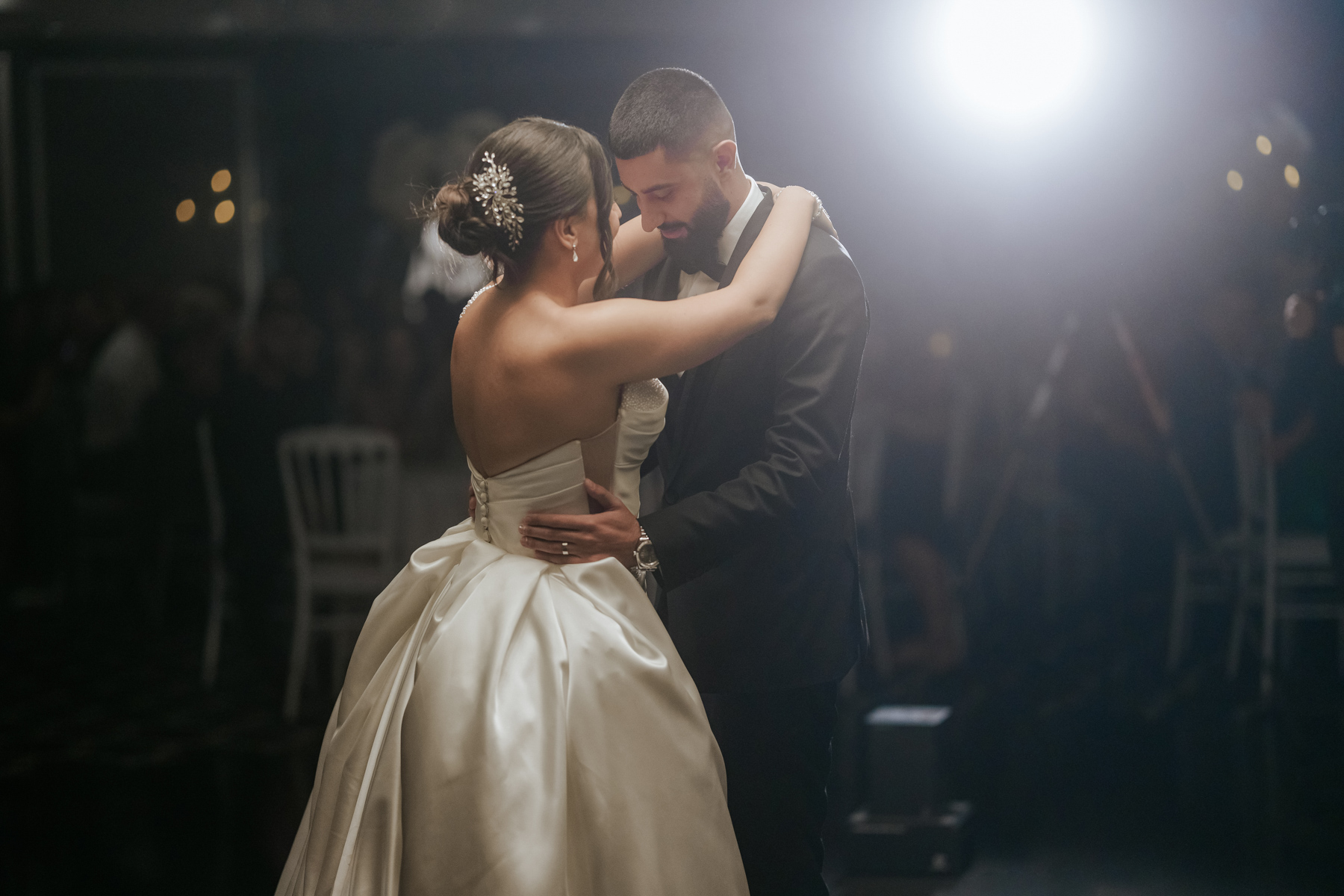 The bride and groom have their first dance together. Such a nice effect with the mist on the floor and the candlelight.
