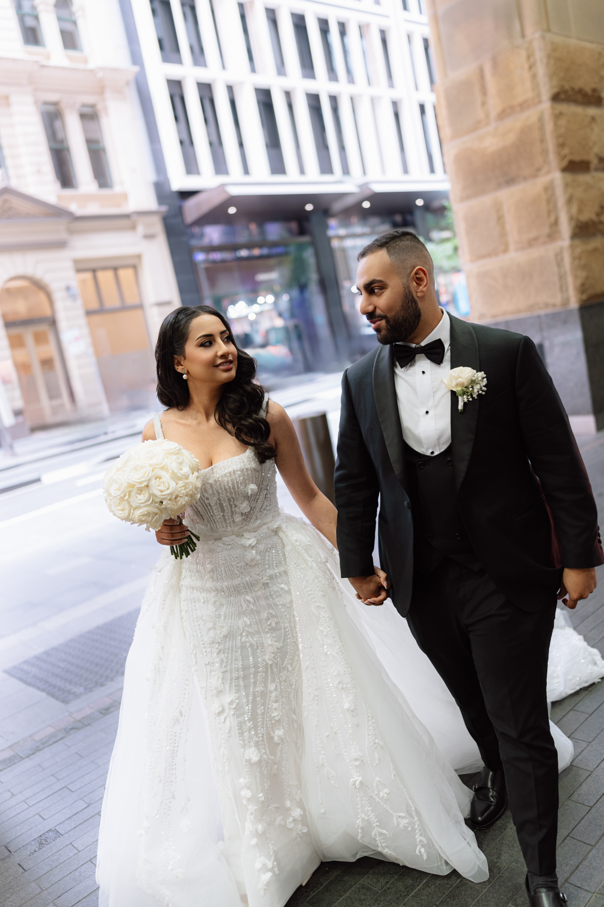 In the wedding dress, stepping out into a new life.