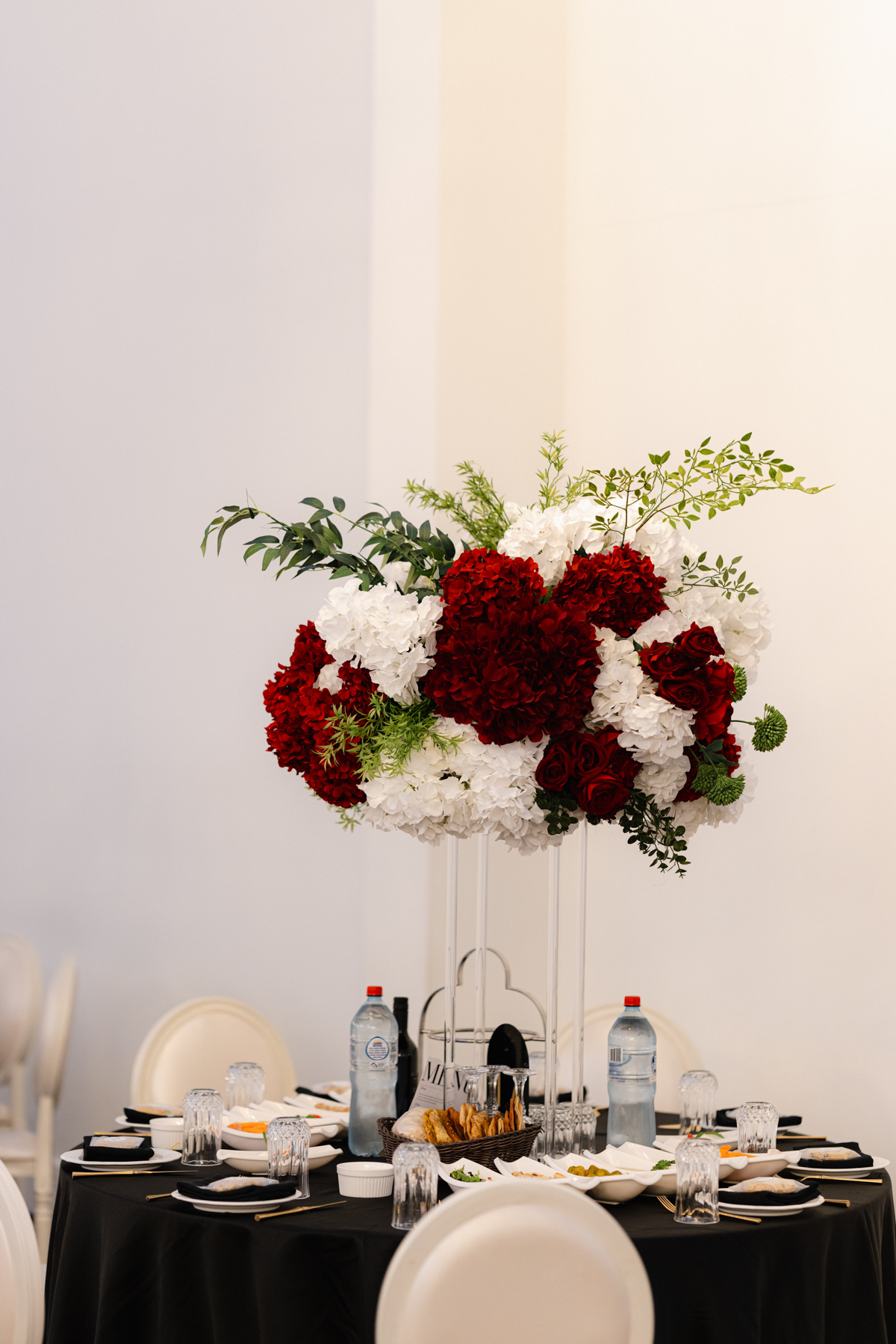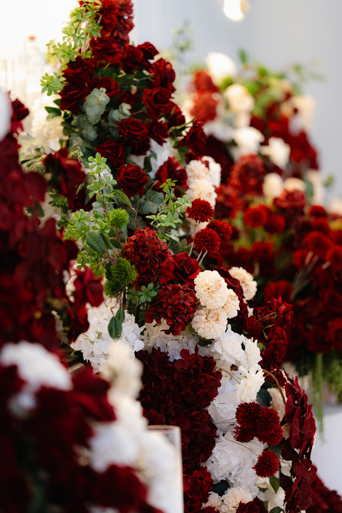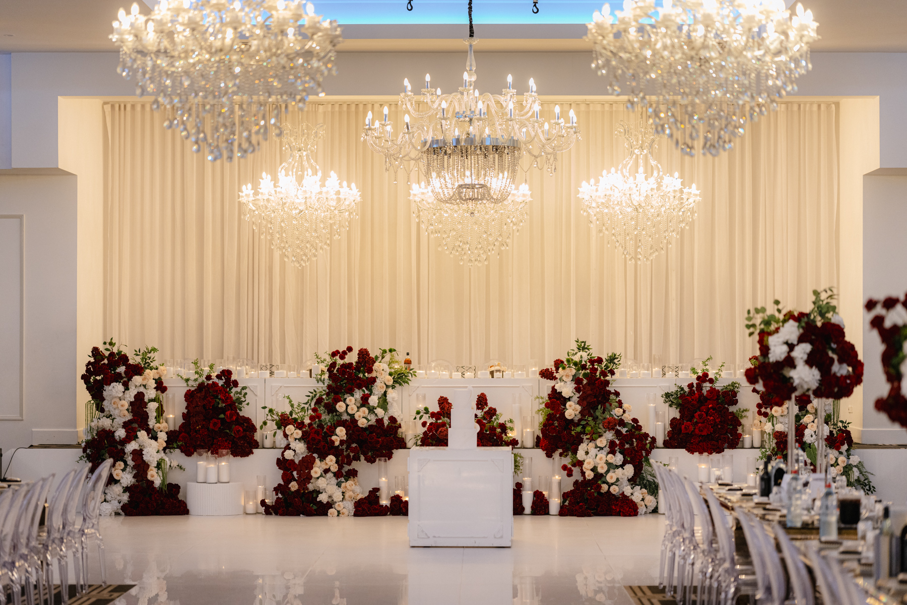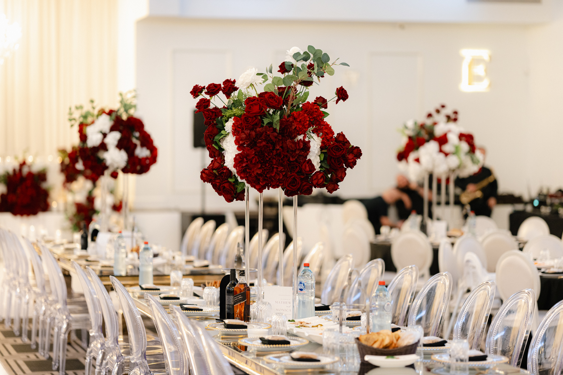 The table settings at the reception, immaculate decor, especially with those rich red with white floral arrangements.