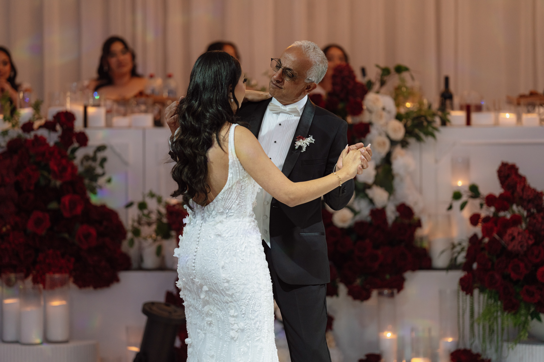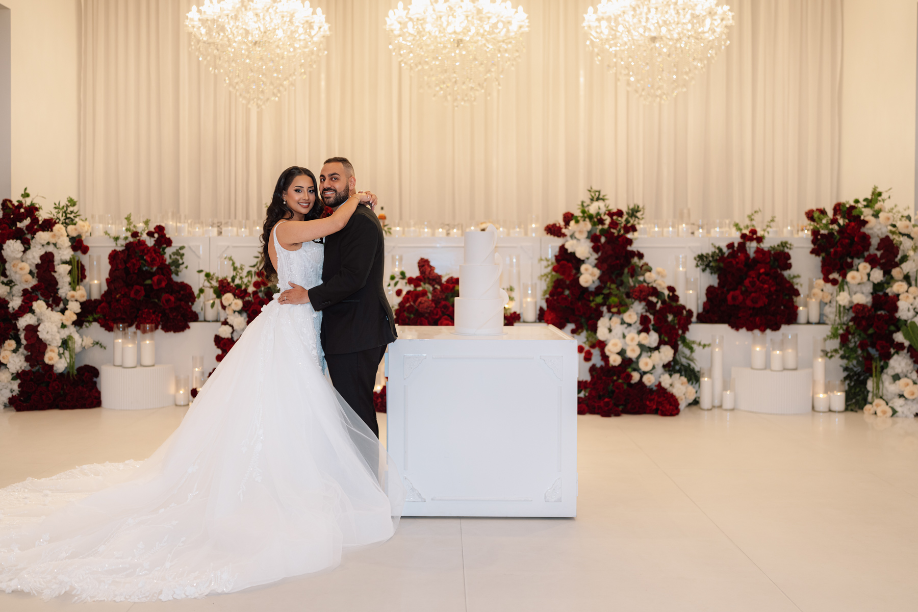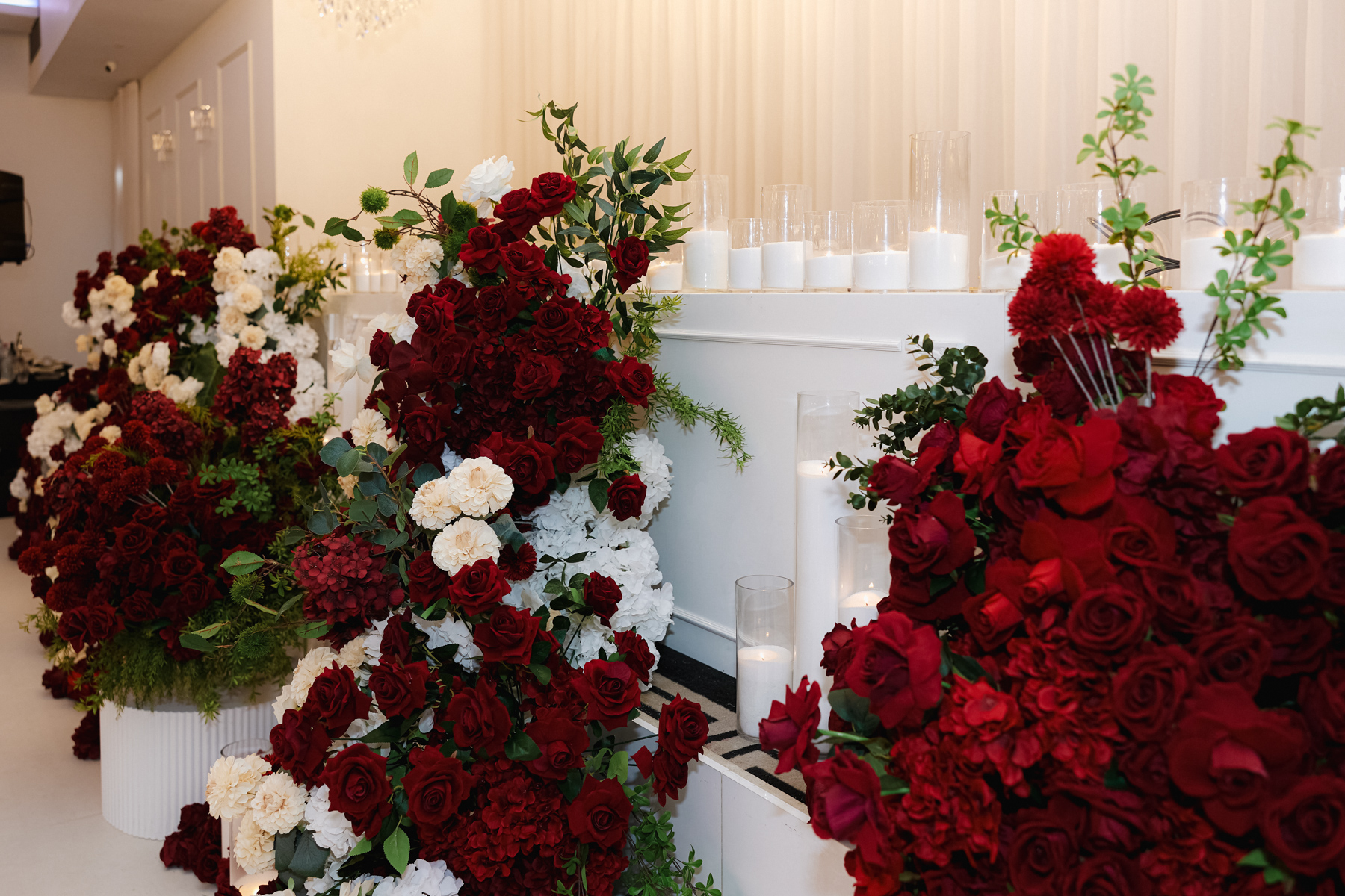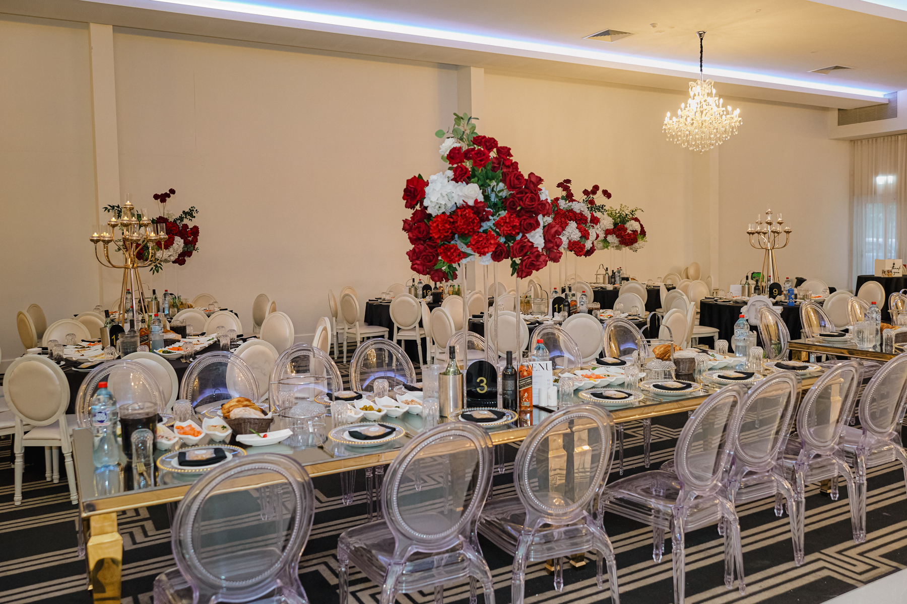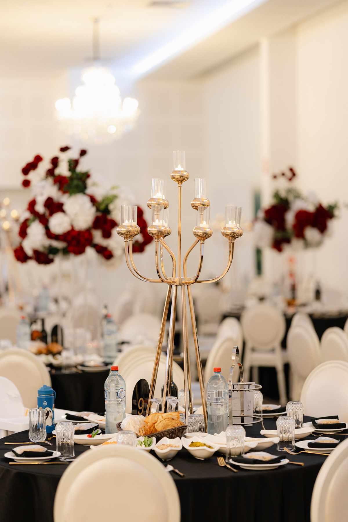 The table settings at the reception, immaculate decor, especially with those rich red with white floral arrangements.