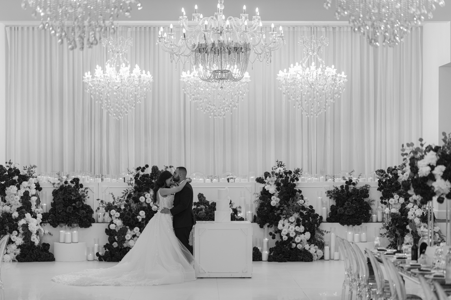 What we want in a wedding photo, the wedding cake, the reception décor and the happily married couple in one image.