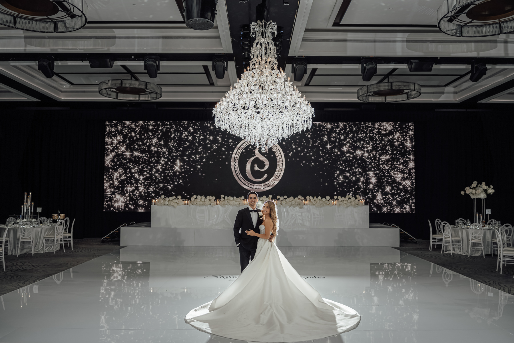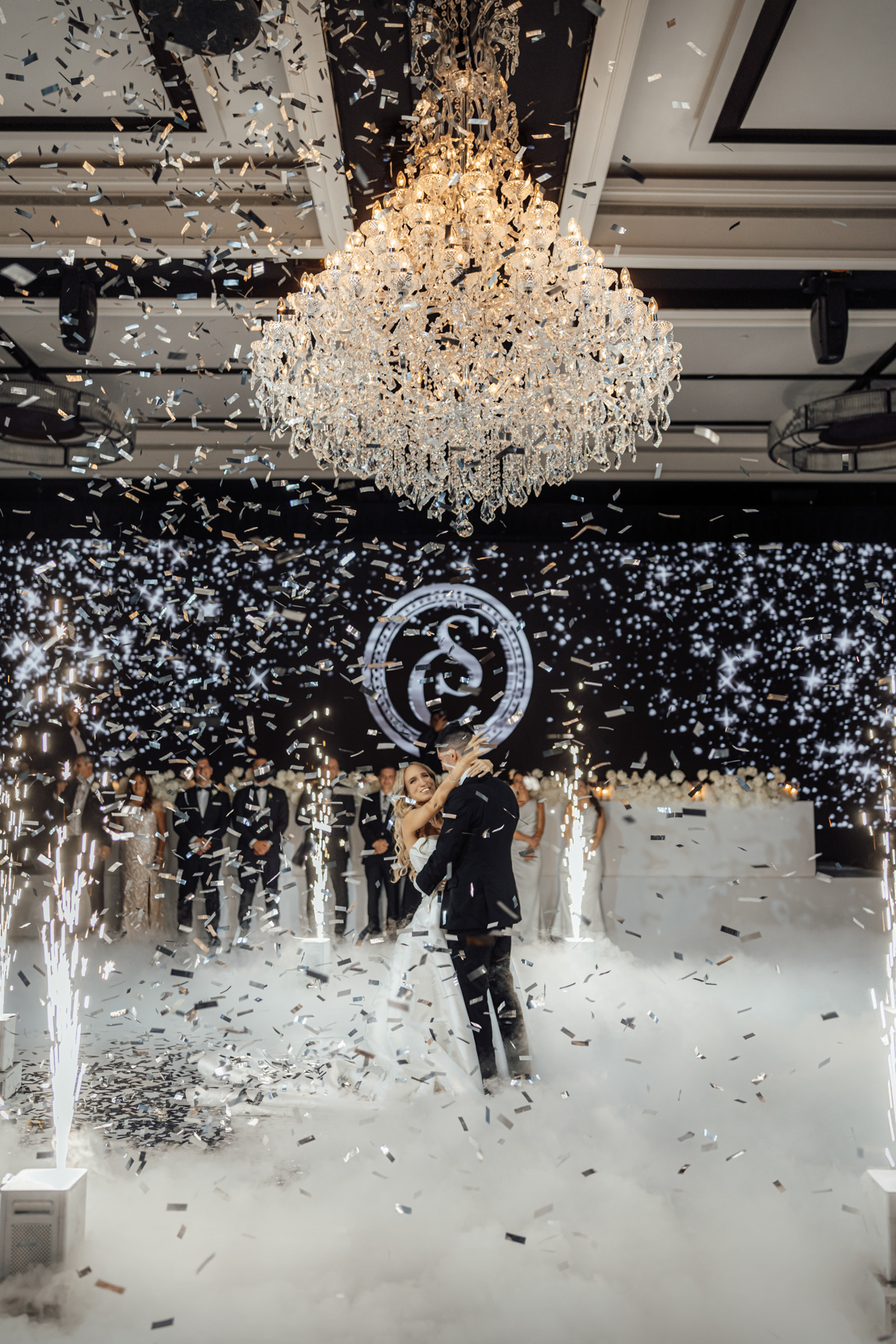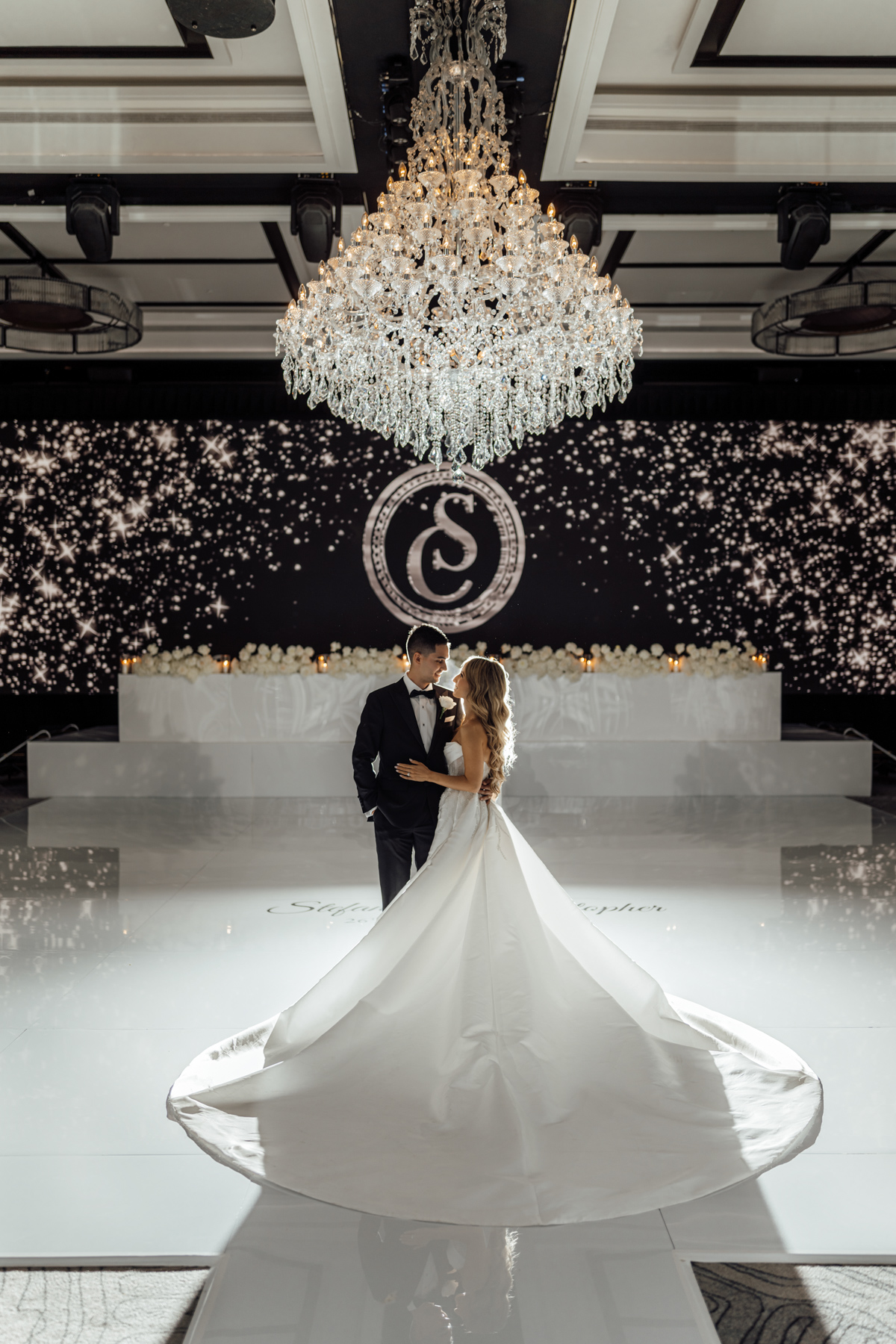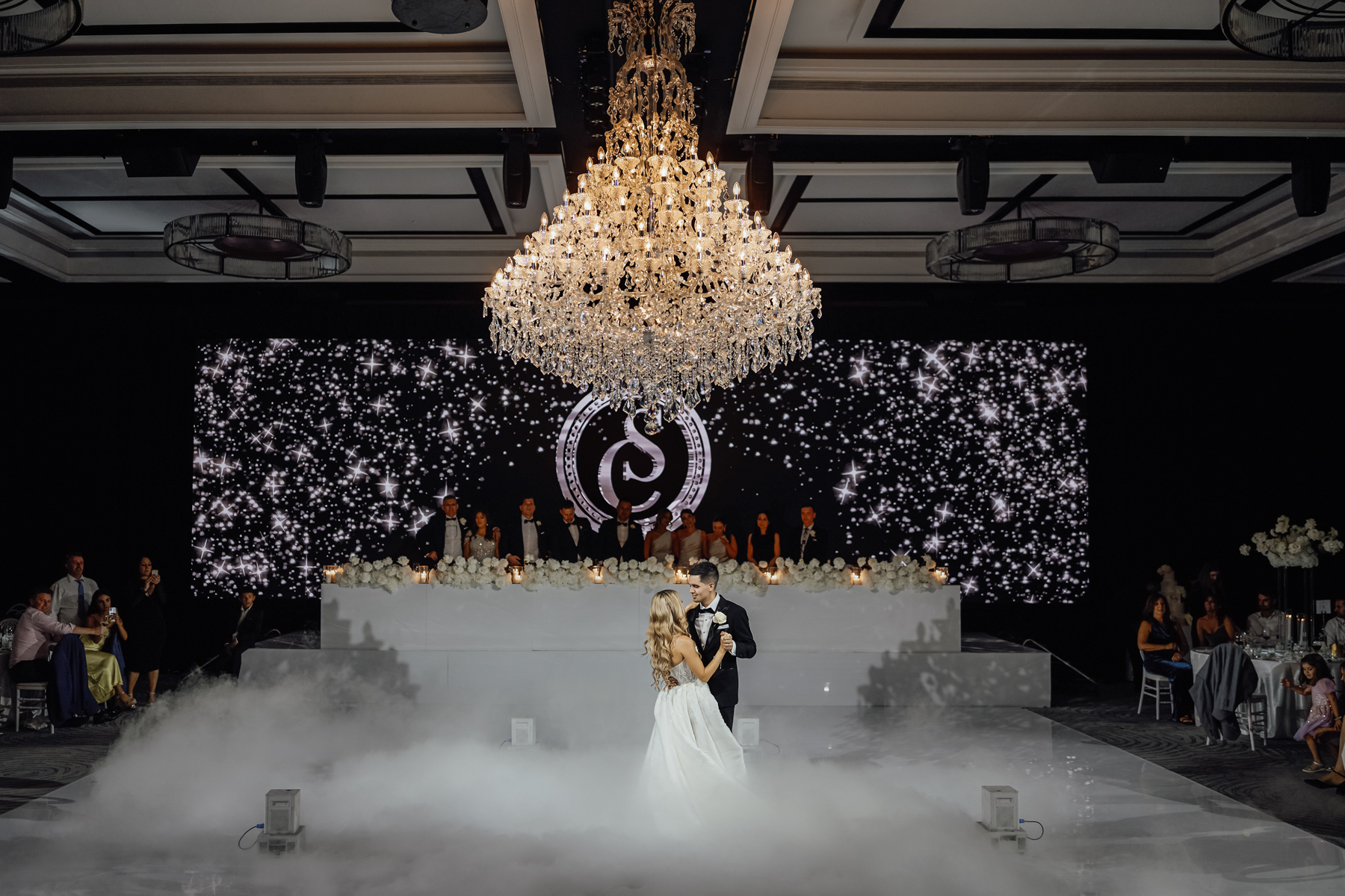 We always like to try and find one image that captures everything. The newlywed couple on the dance floor, the smoke, the chandler, the stars in the background. All with that sense of balance and symmetry.