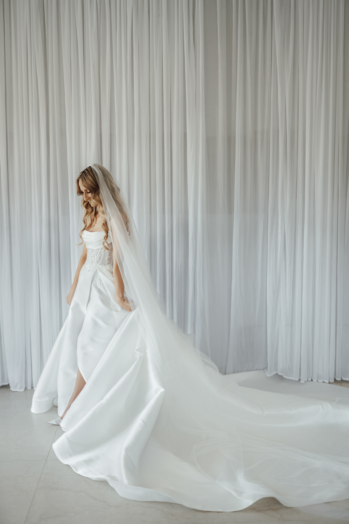 The bride considers her dress, an impressive design.
