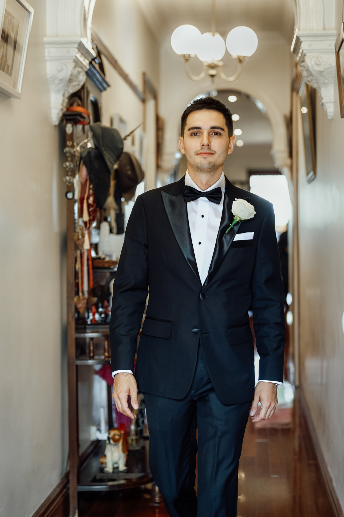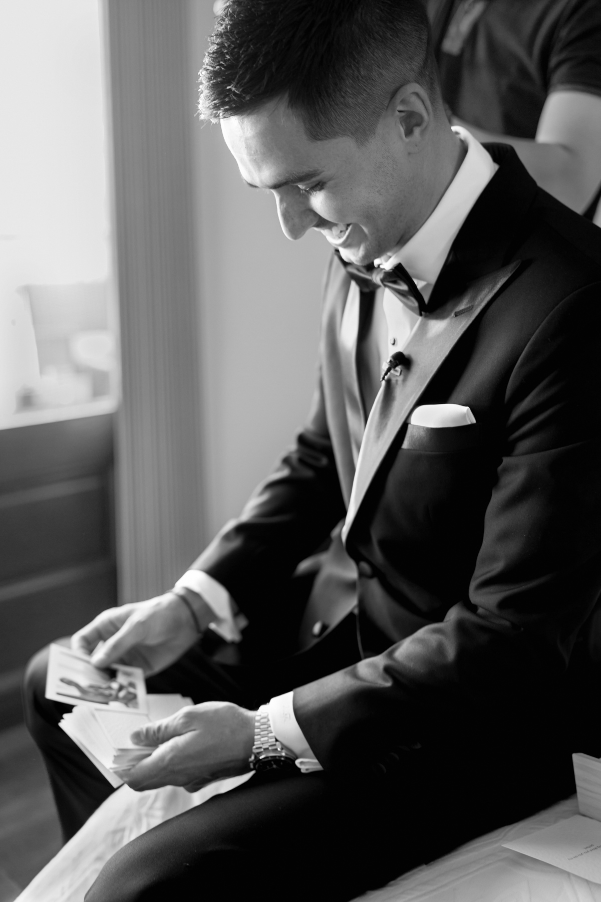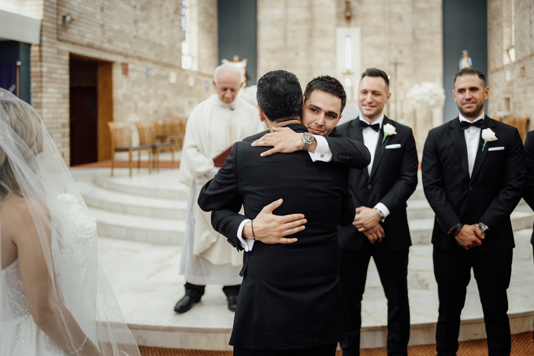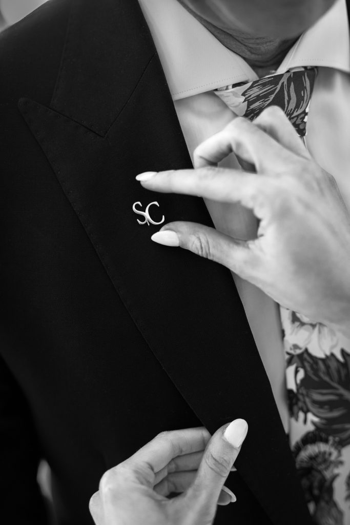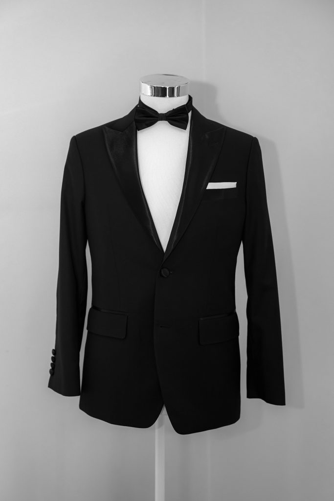The groom’s jacket. Such an elegant look juxtaposed with the white flowers.