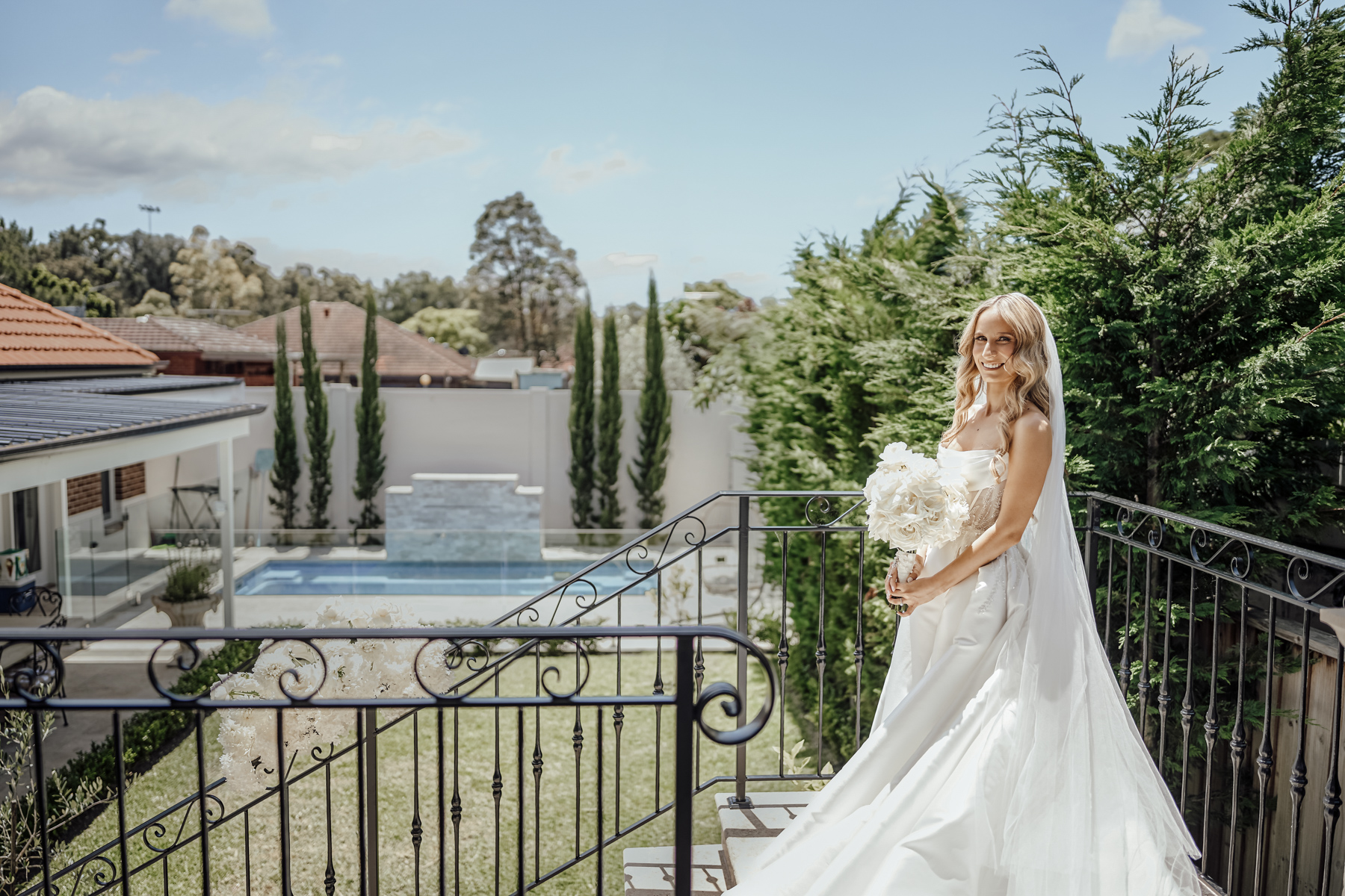 The bride by the staircase. We don’t usually get an outdoor stairway in a photo, but the colours here just looked right.