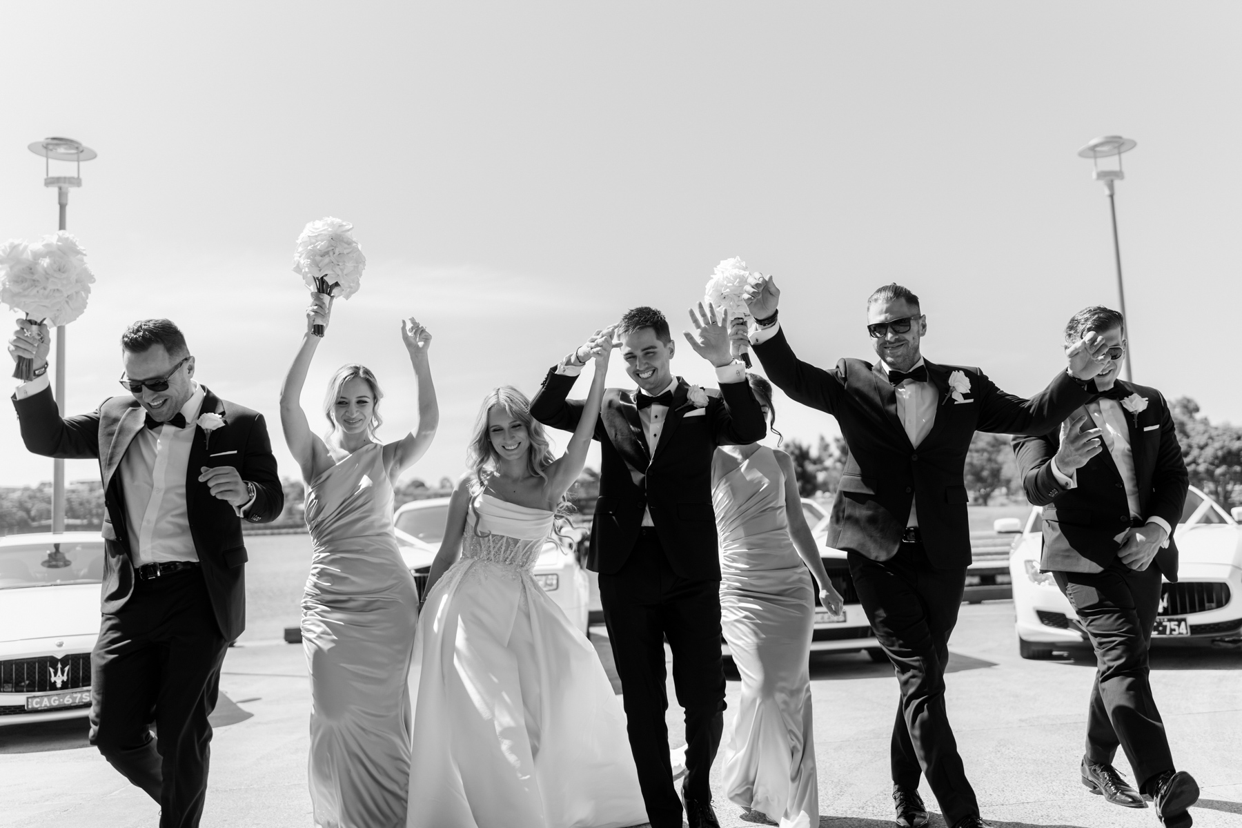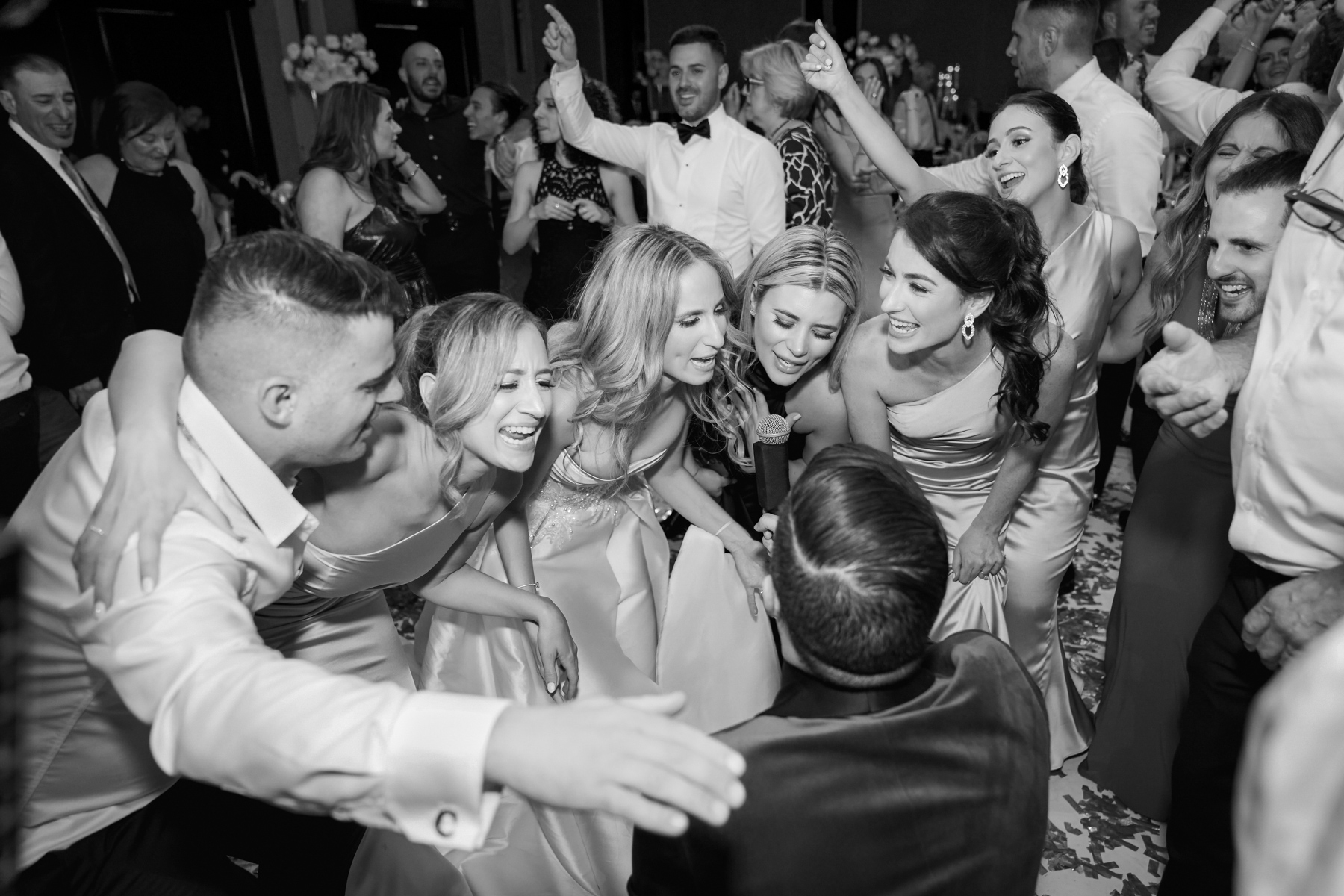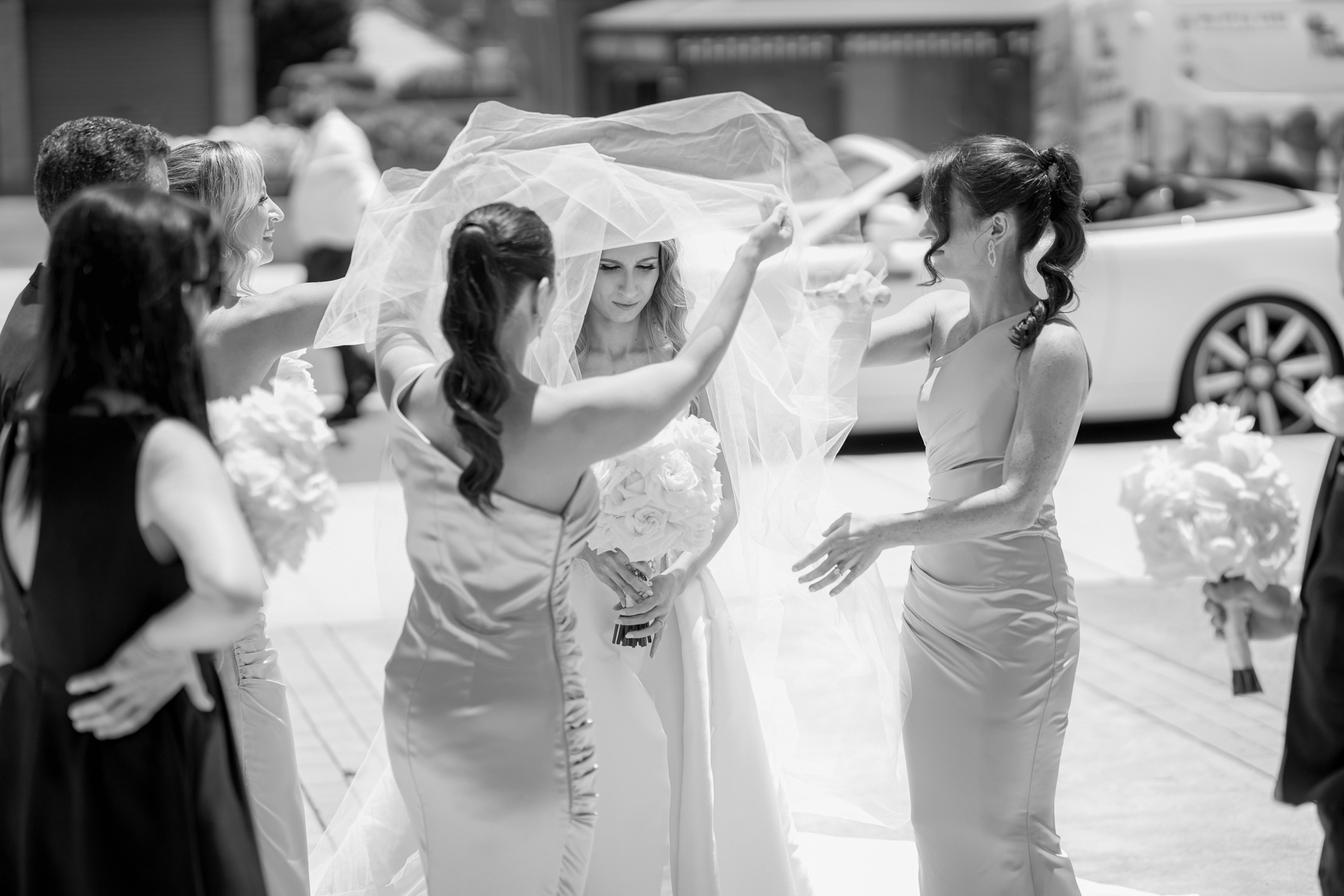 A black and white image of the bride’s wedding party.