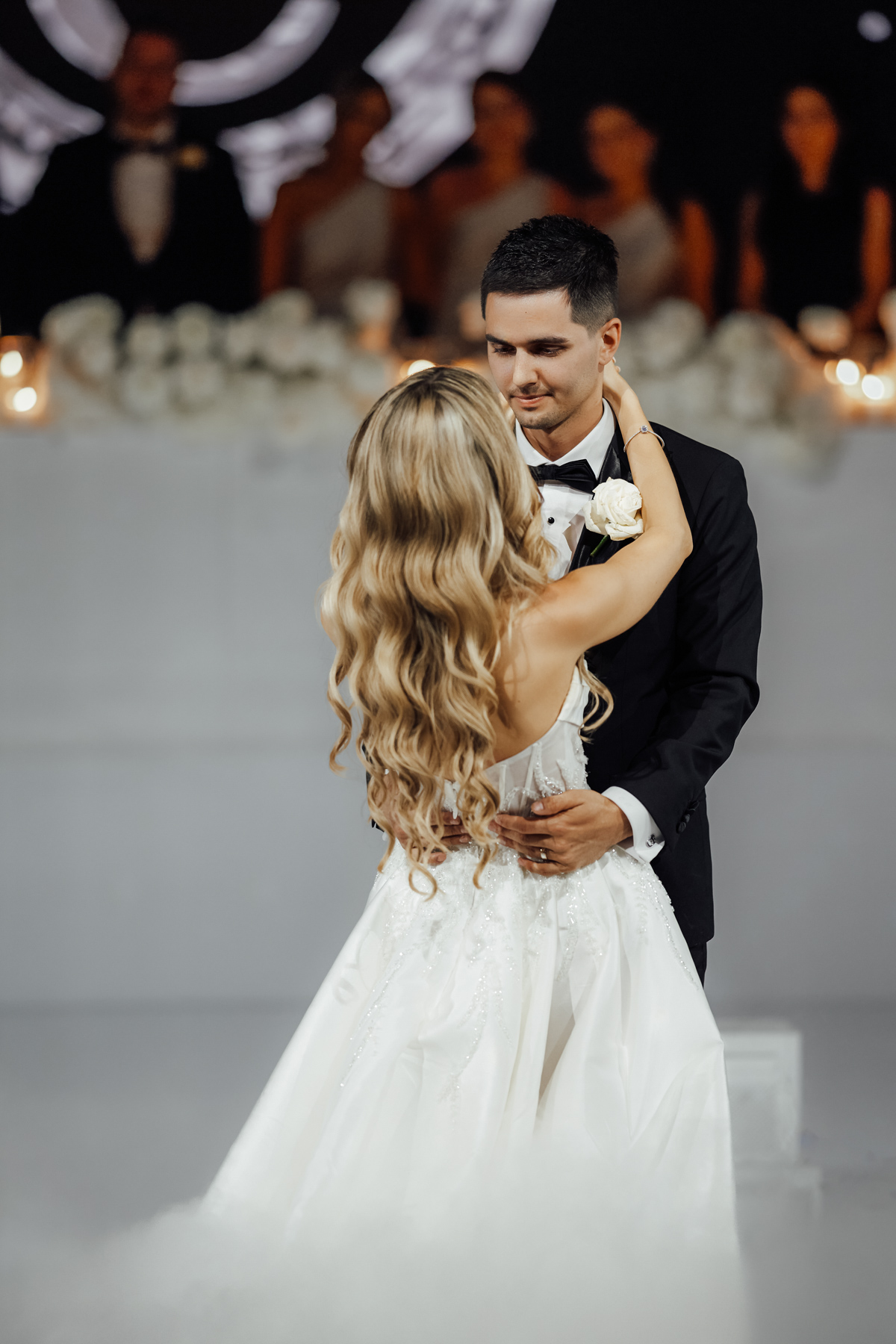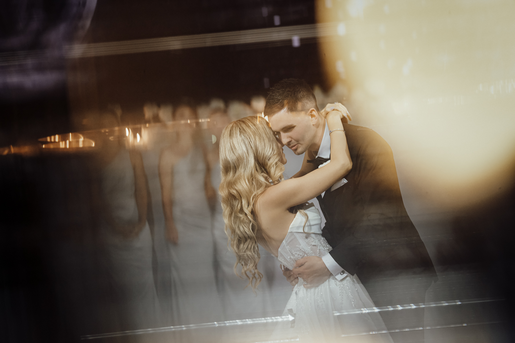 Lights and tinsel as the bride and groom dance.