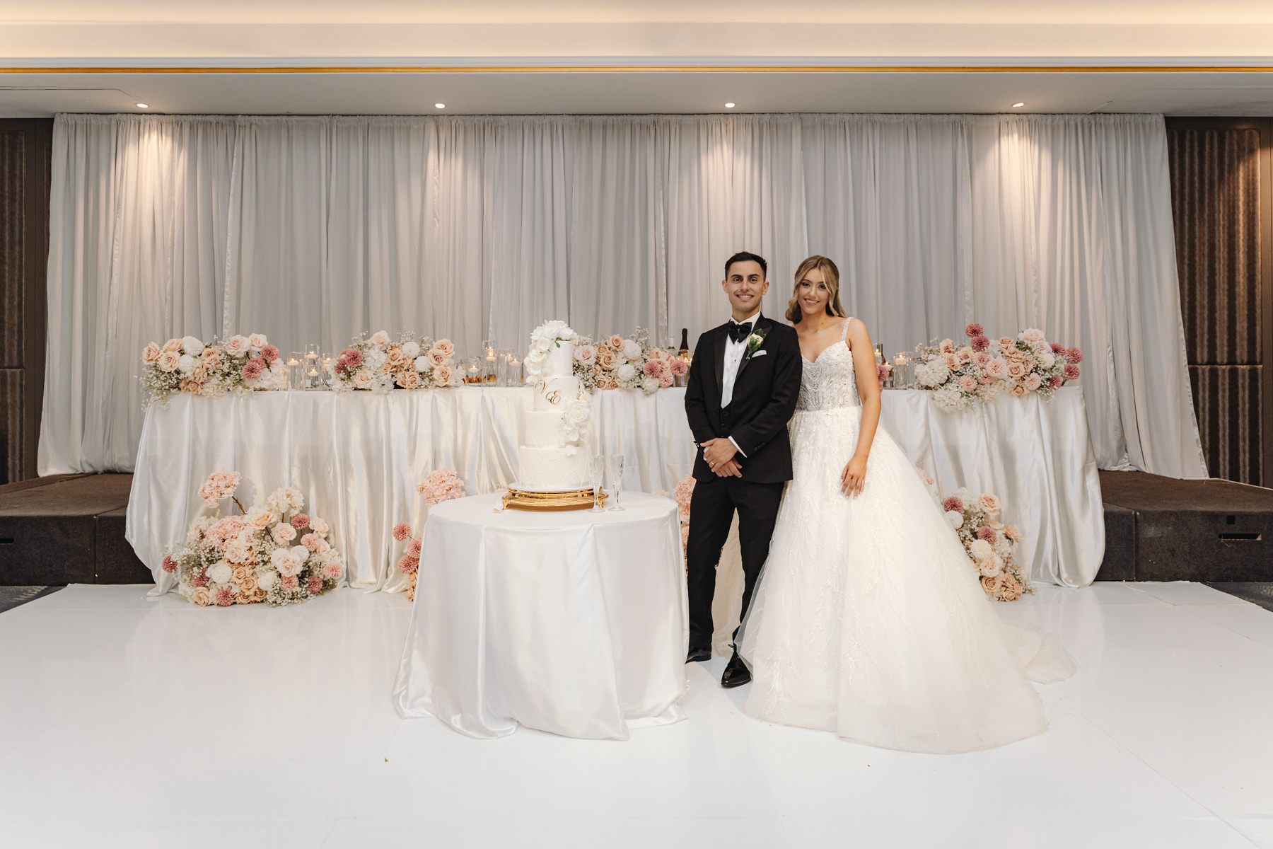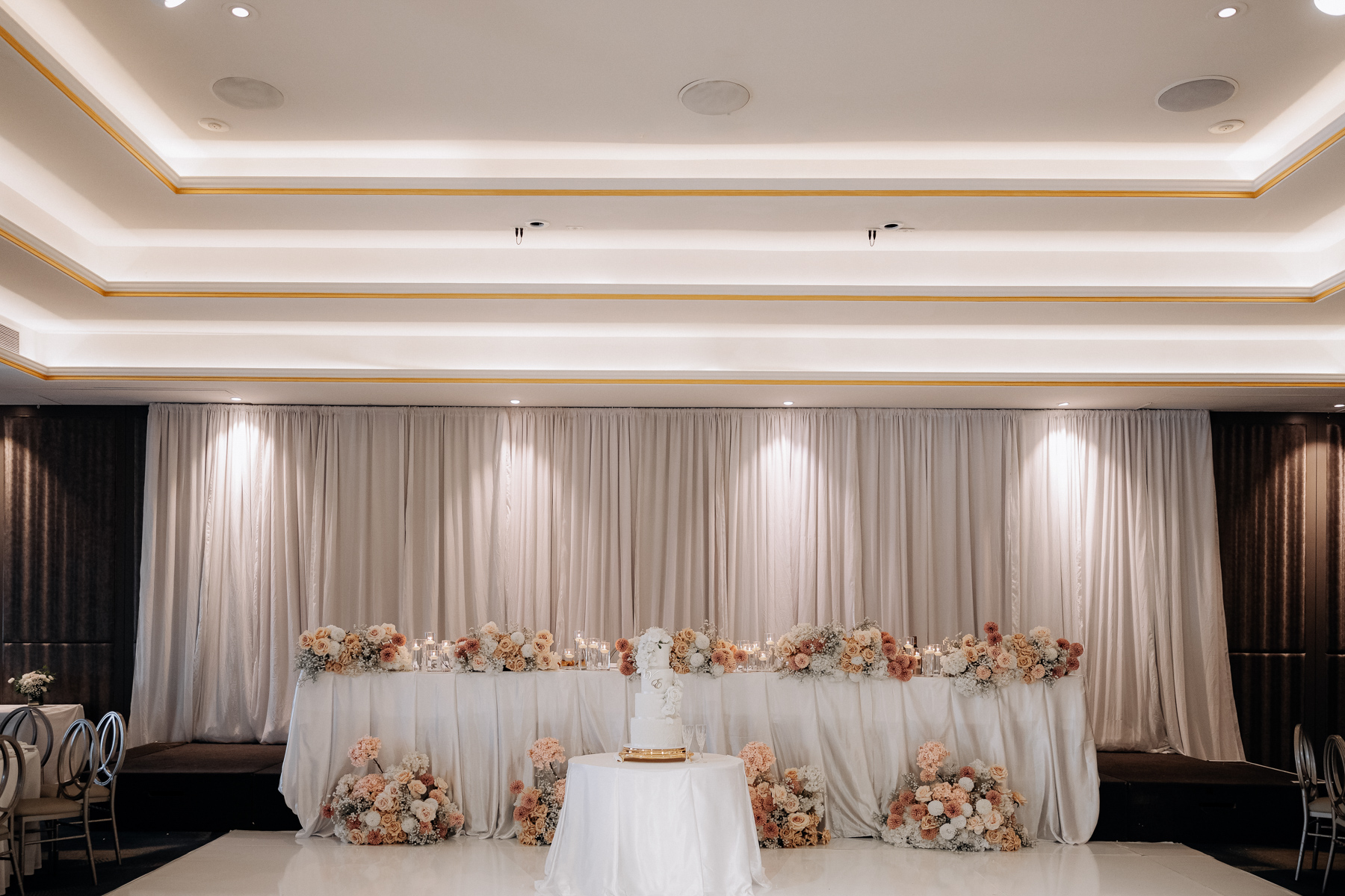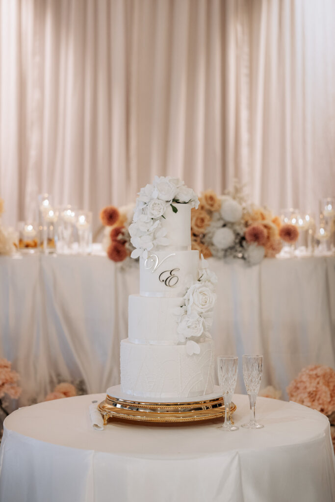 A most impressive four tier wedding cake. Like the venue around it, all white and gold.