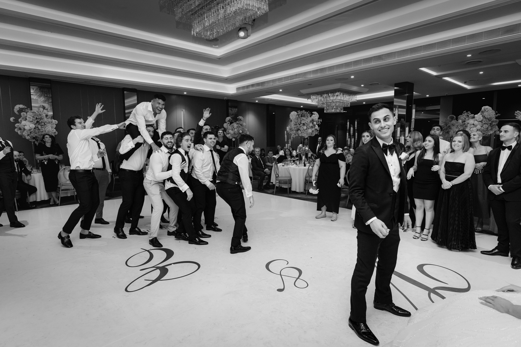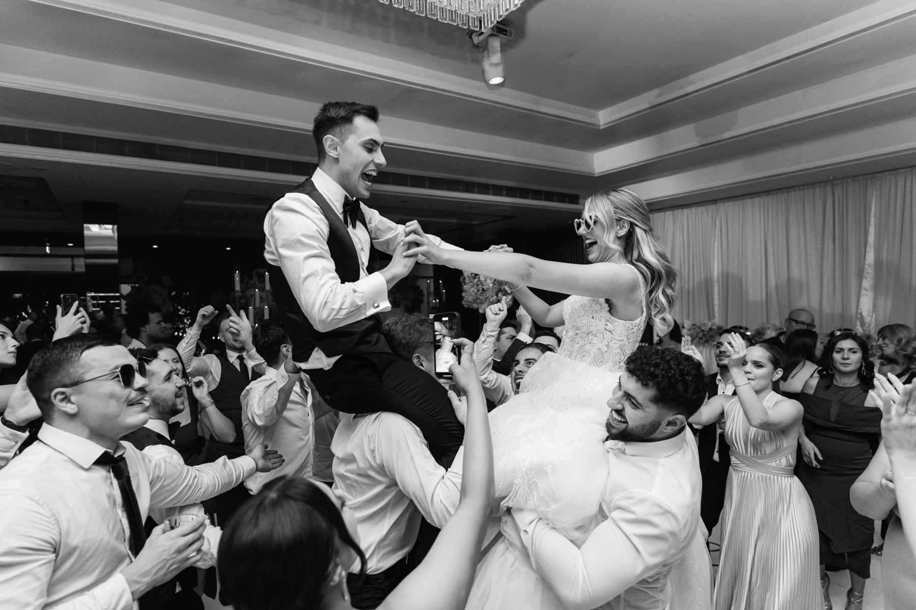 Bride and groom carried by their guests.