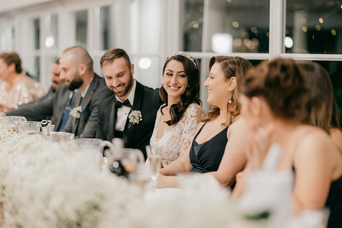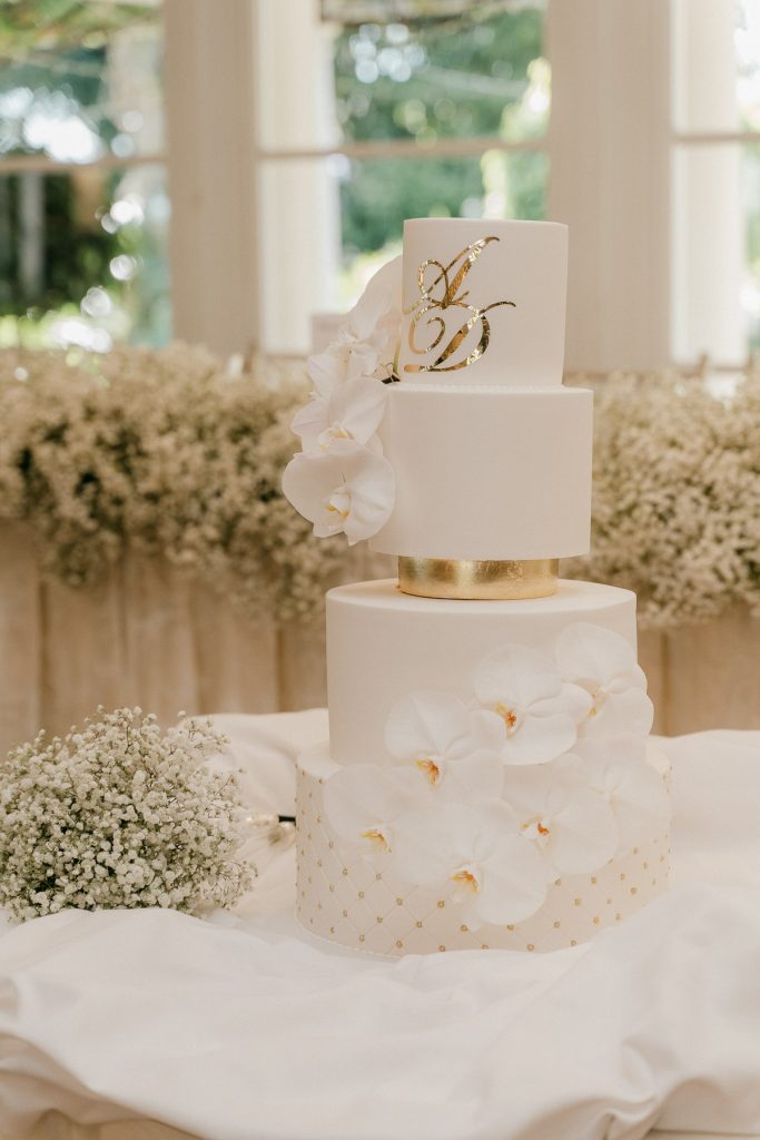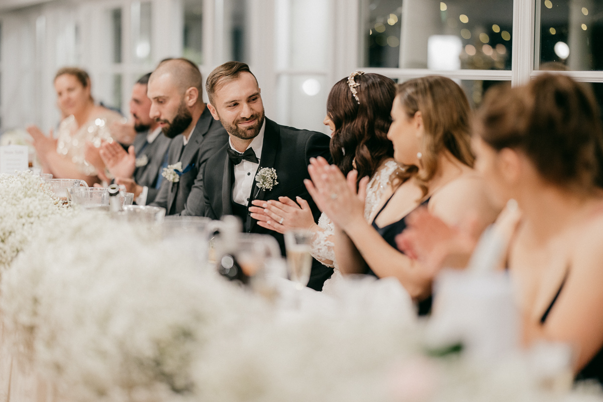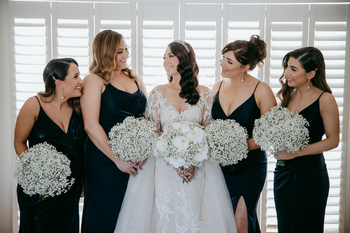 Subdued light colours for floral arrangements, which match the bridesmaid’s dresses.