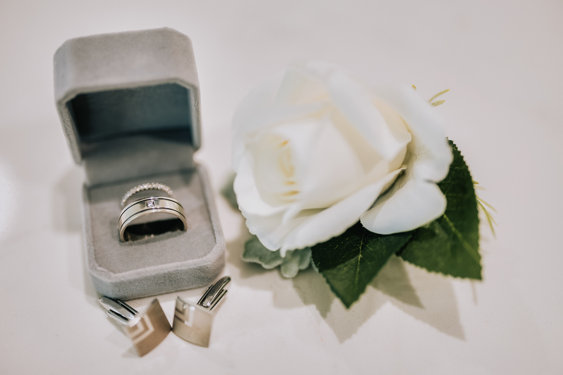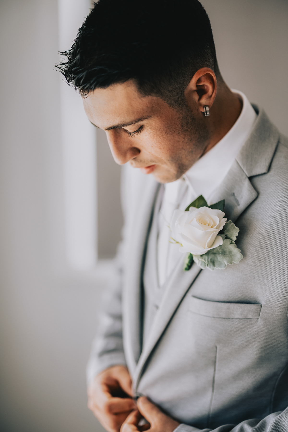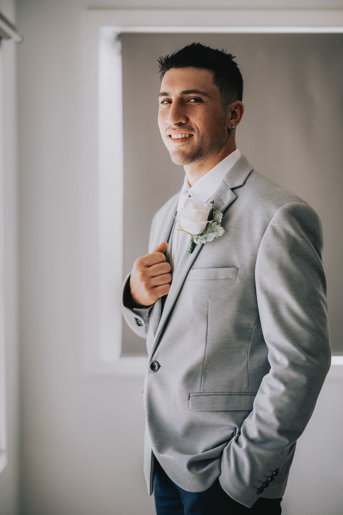 Dominic forgoes the traditional black tuxedo, but with a matching ring, cufflinks and an earring he set his own sense of impressive style.