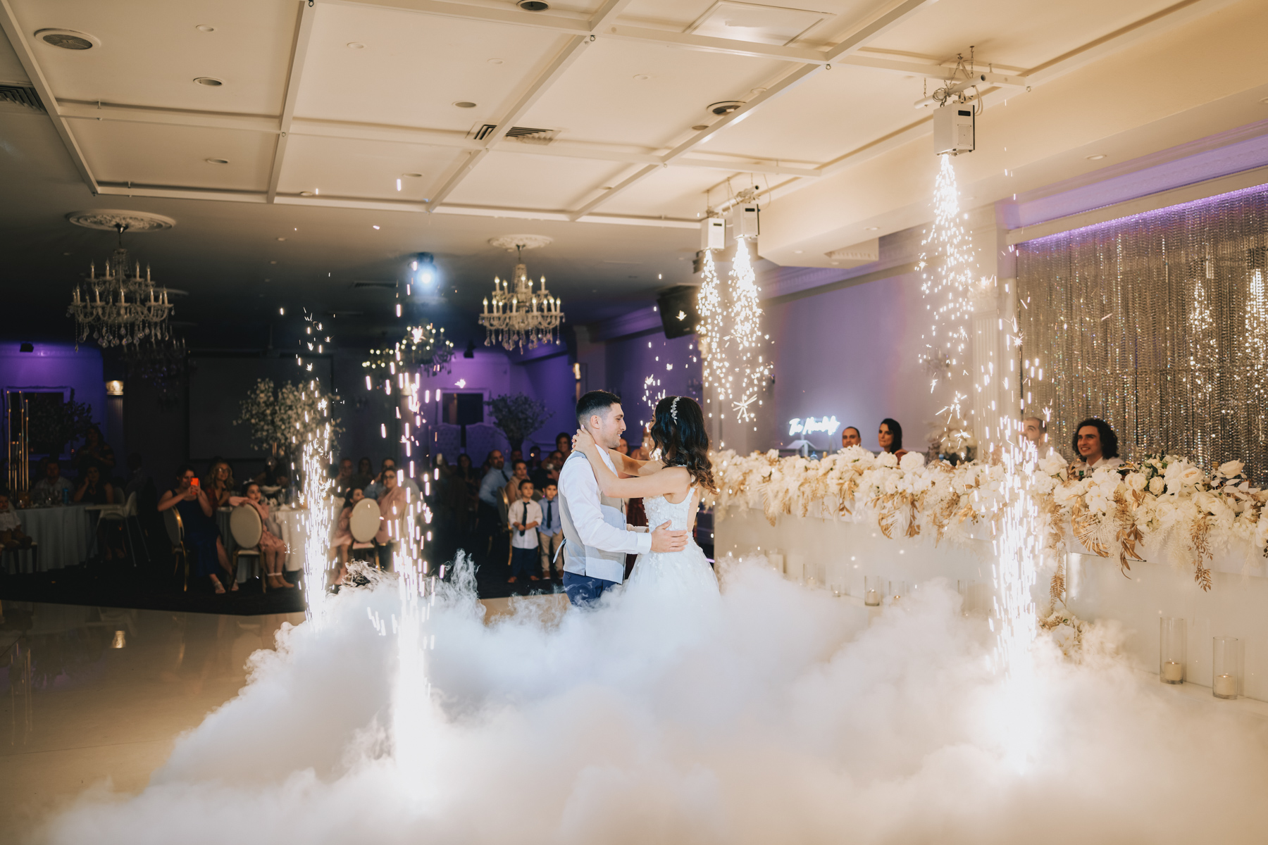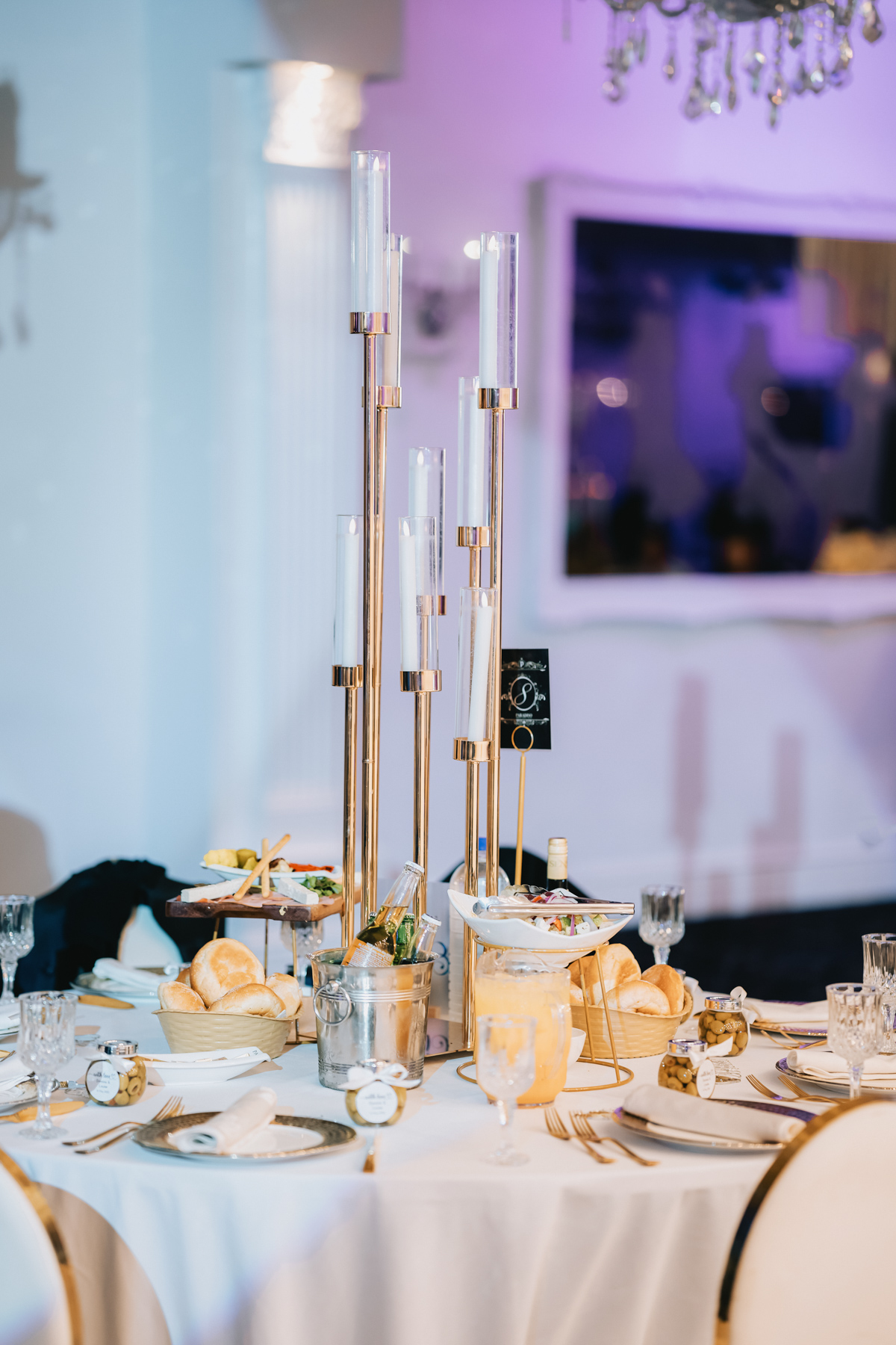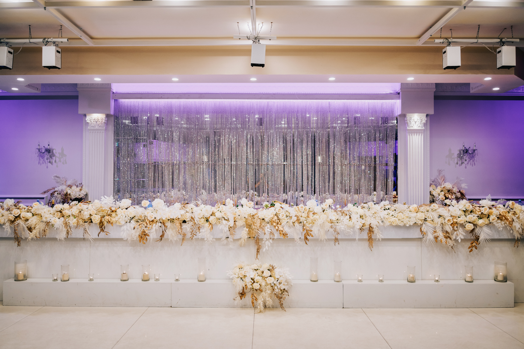 The reception hall looked incredible. Vivid white floral arrangements with golden brown trim. Purple lighting, so rich and pure.