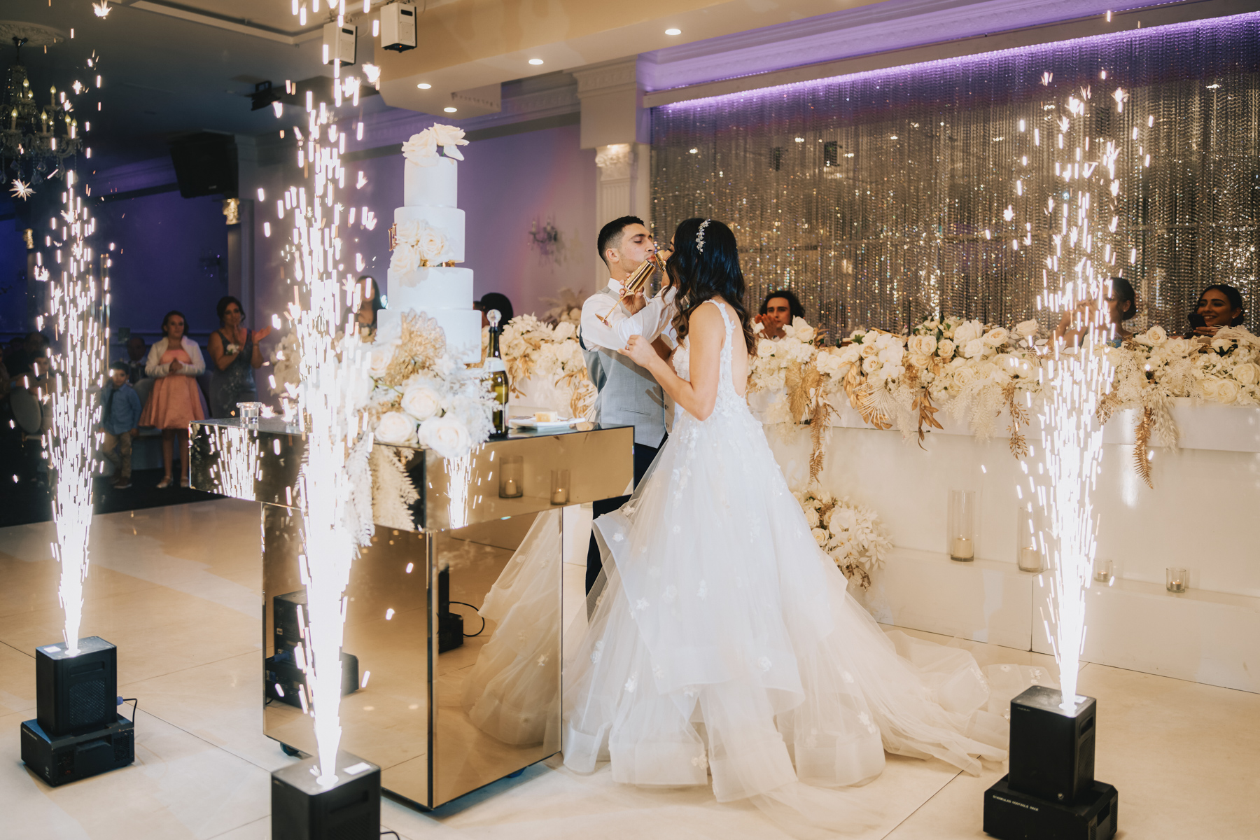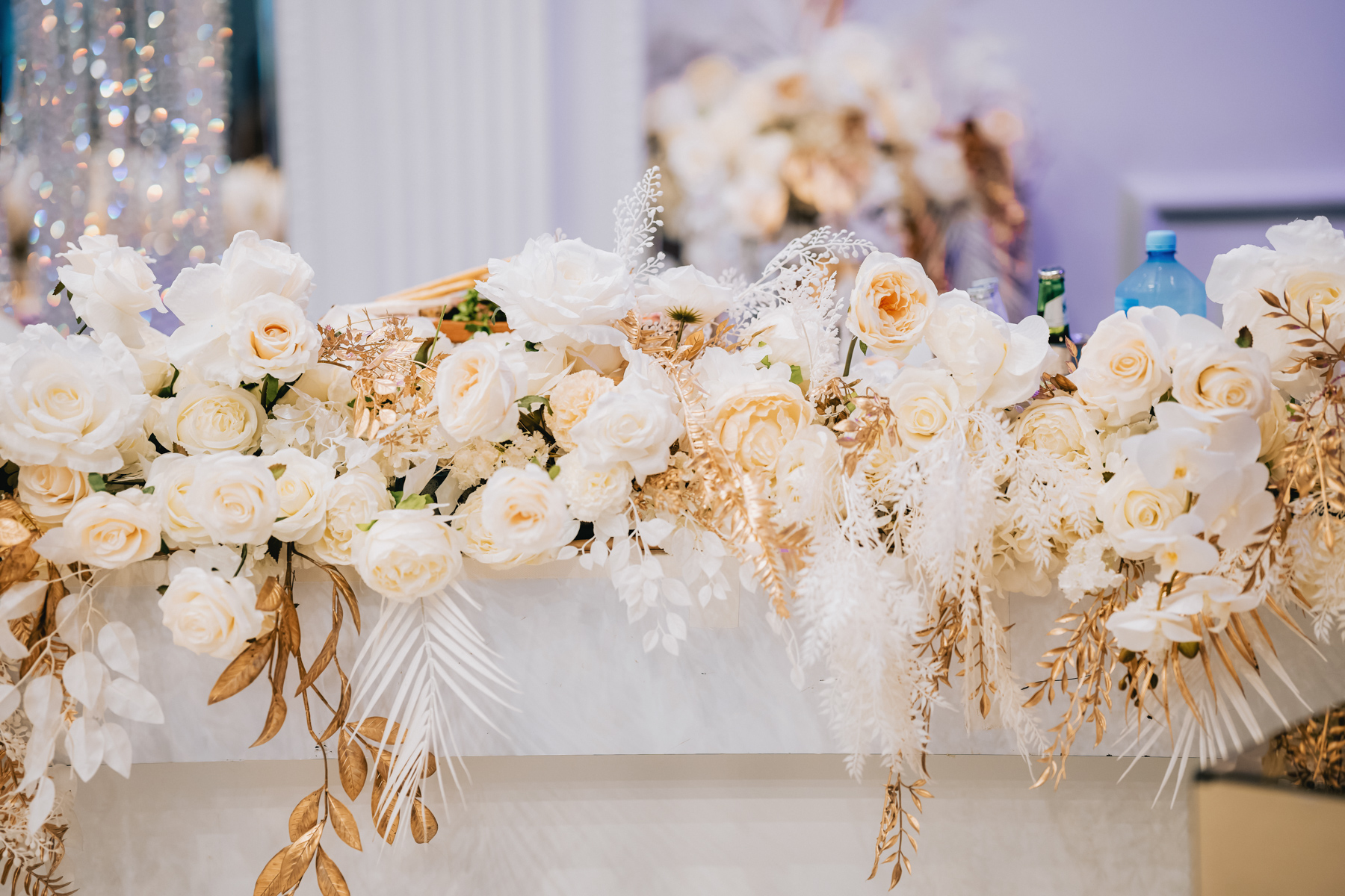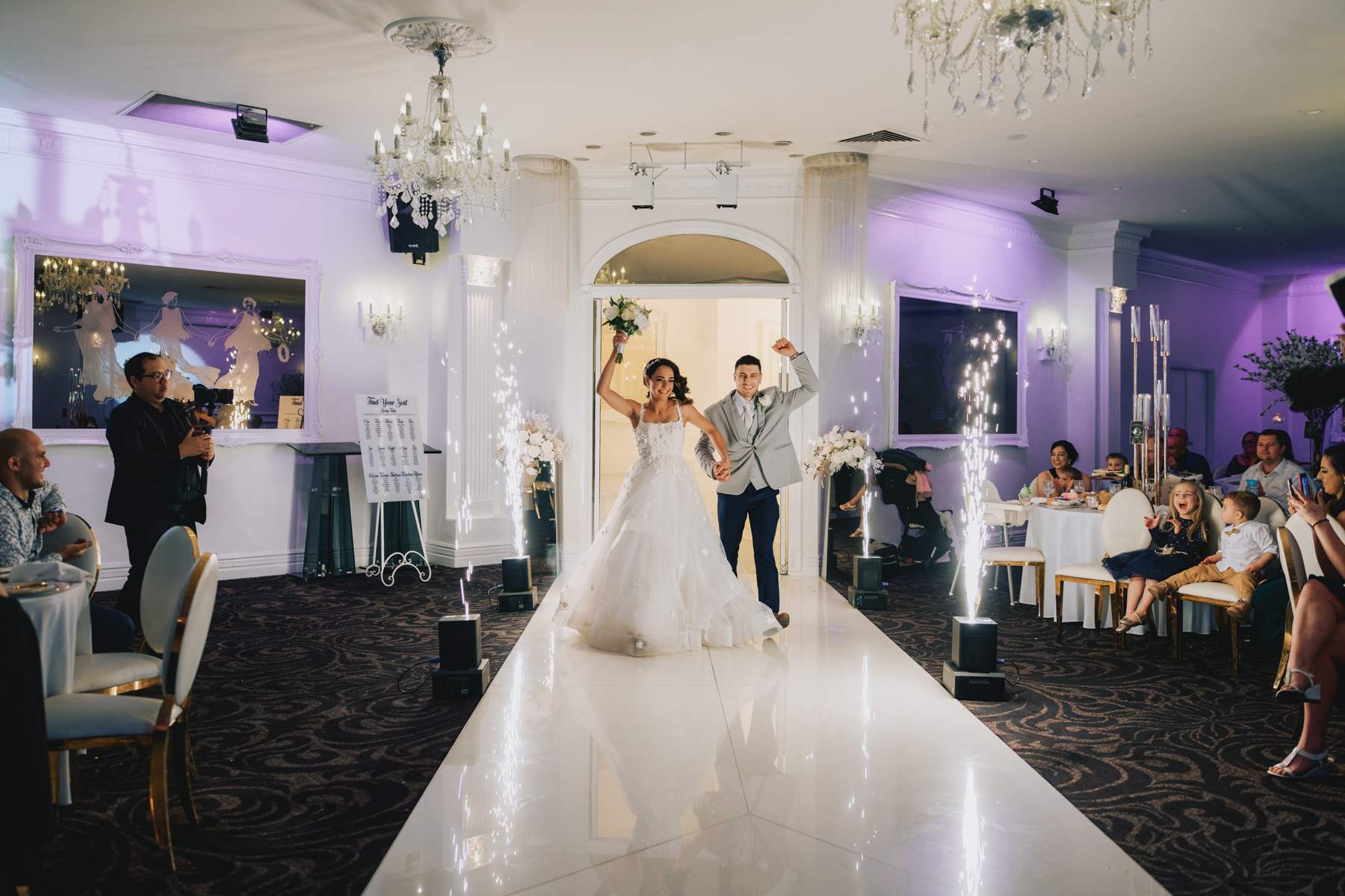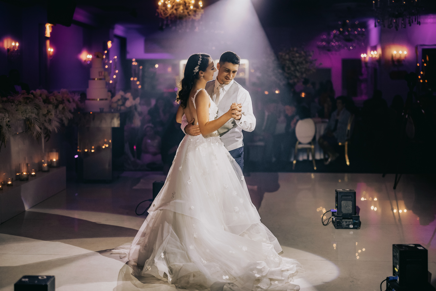 The reception hall looked incredible. Vivid white floral arrangements with golden brown trim. Purple lighting, so rich and pure.
