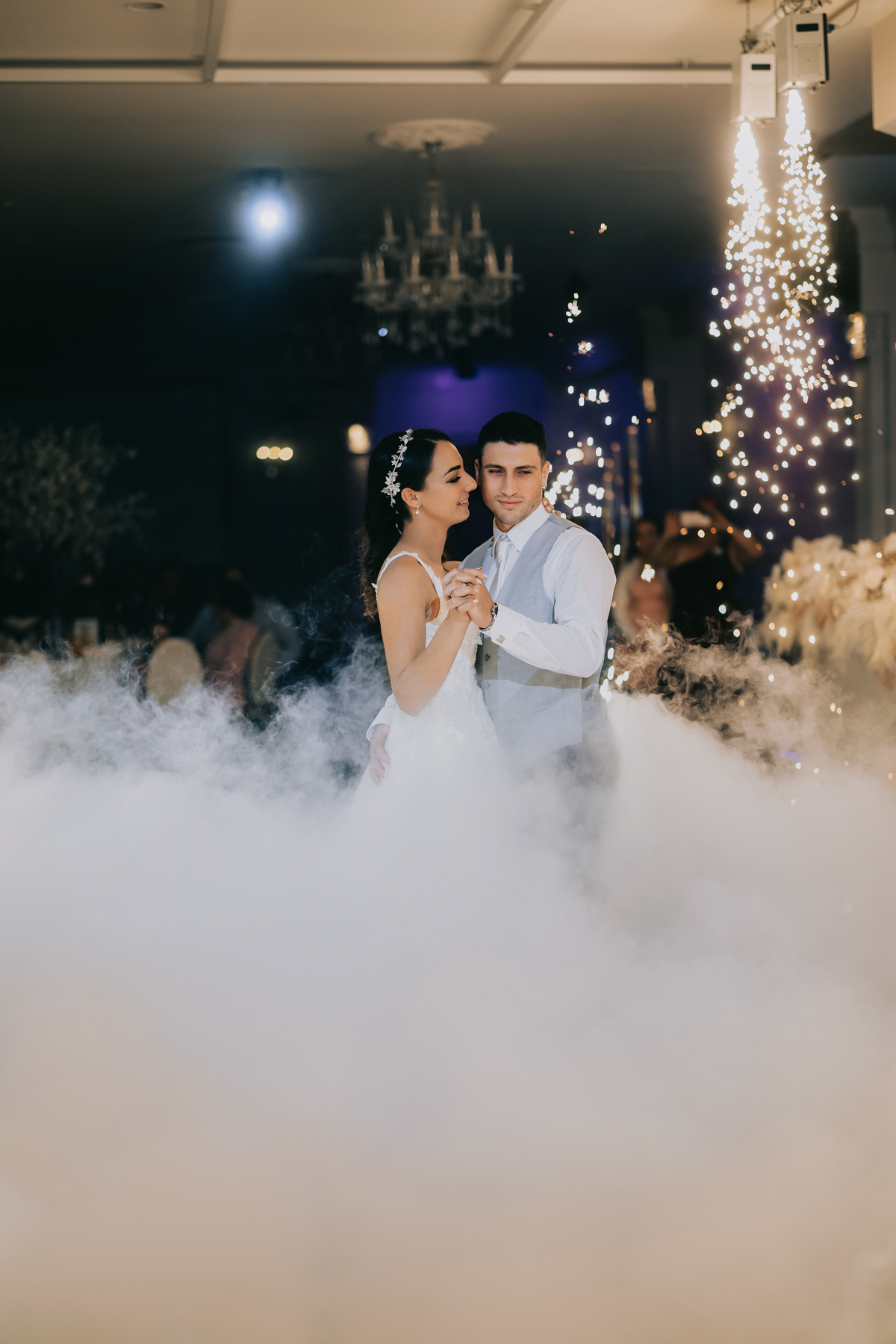 The new bride and groom dance in the mist and lights. The first steps together for their new life.
