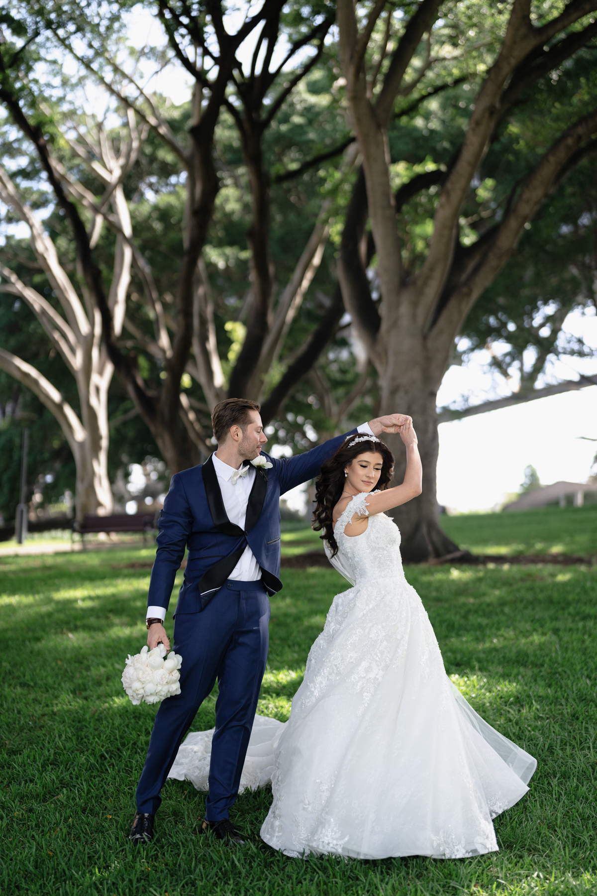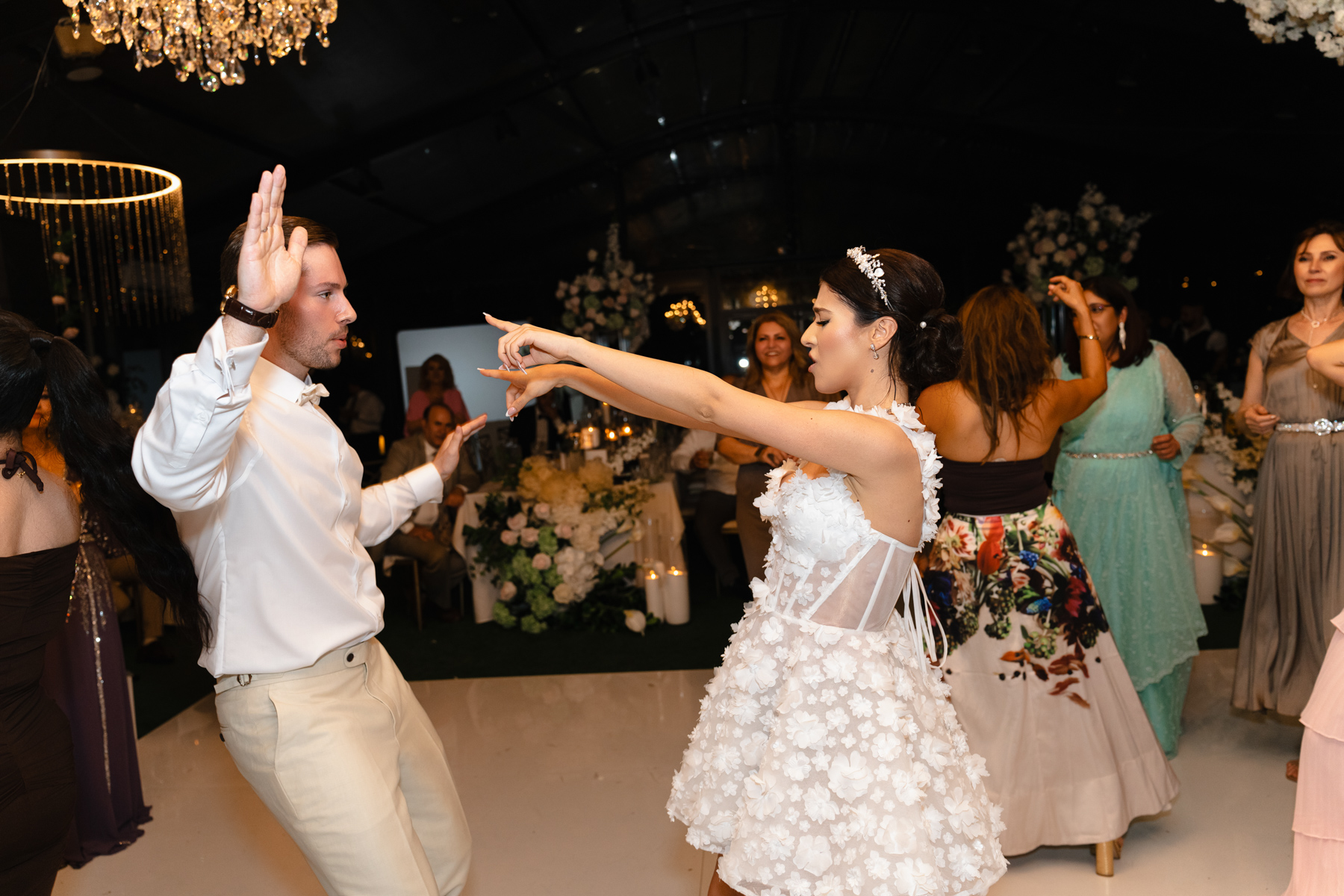 The newlywed couple have their first dance beneath the chandeliers.