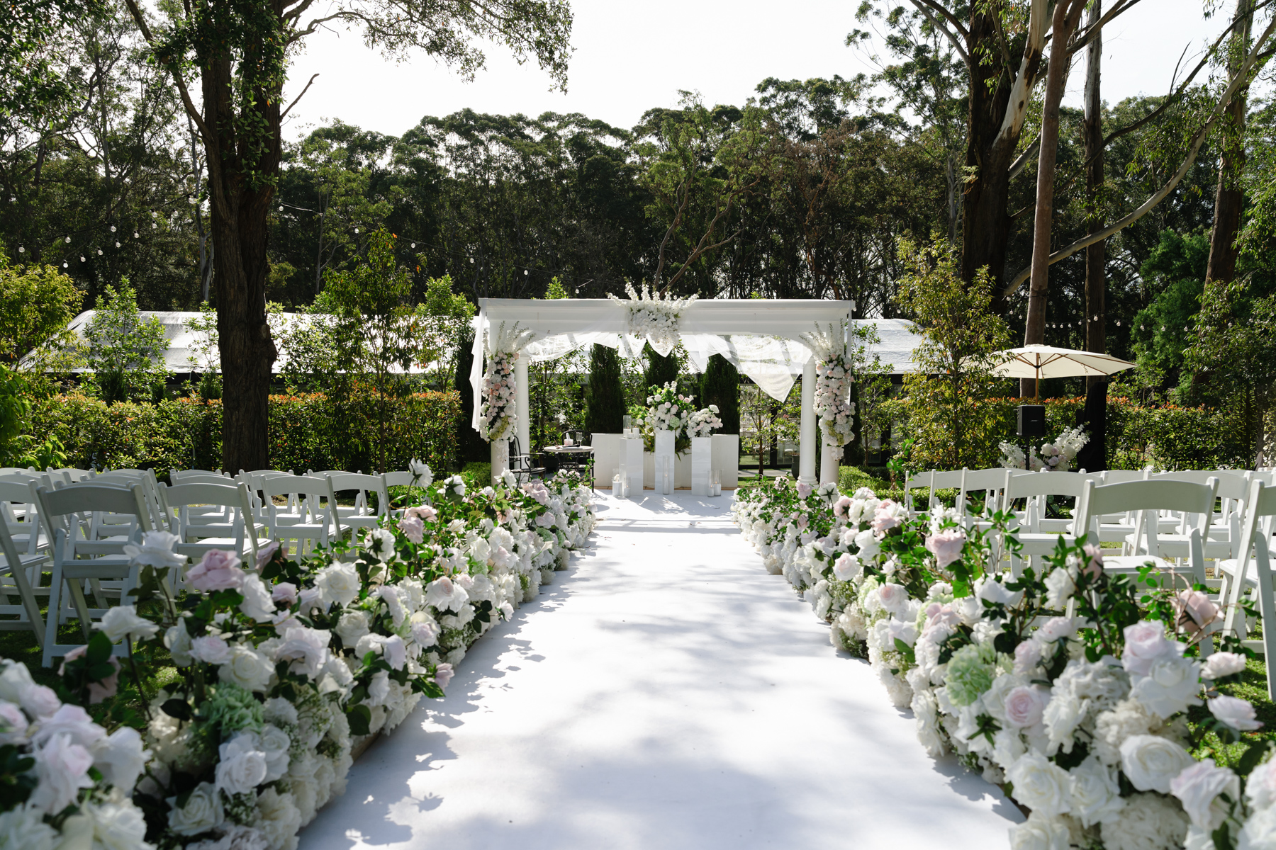 The outdoor ceremony was very elegant. Nice to have flowers and white furnishings to complement the natural landscape.