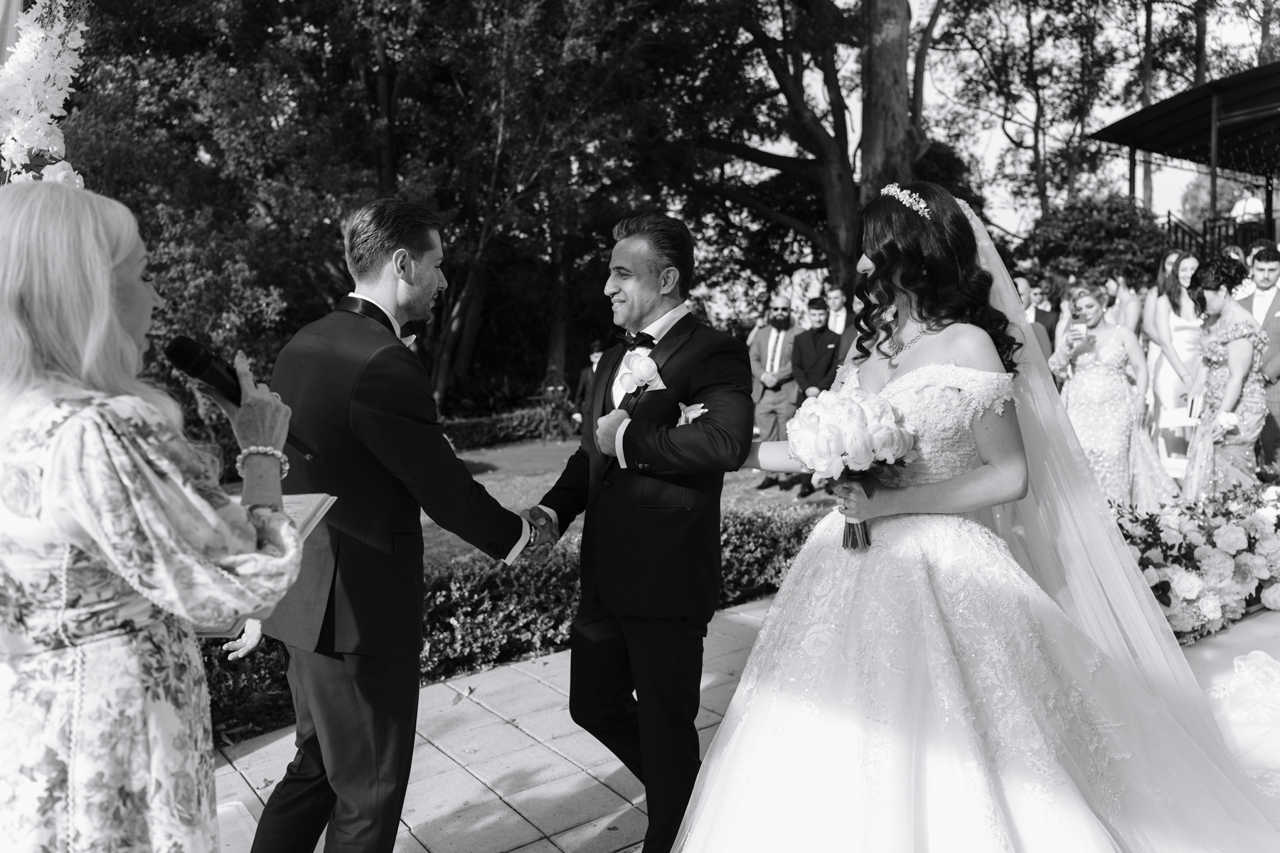 Exchanging the wedding attire for the reception attire, for a more open and friendly vibe.