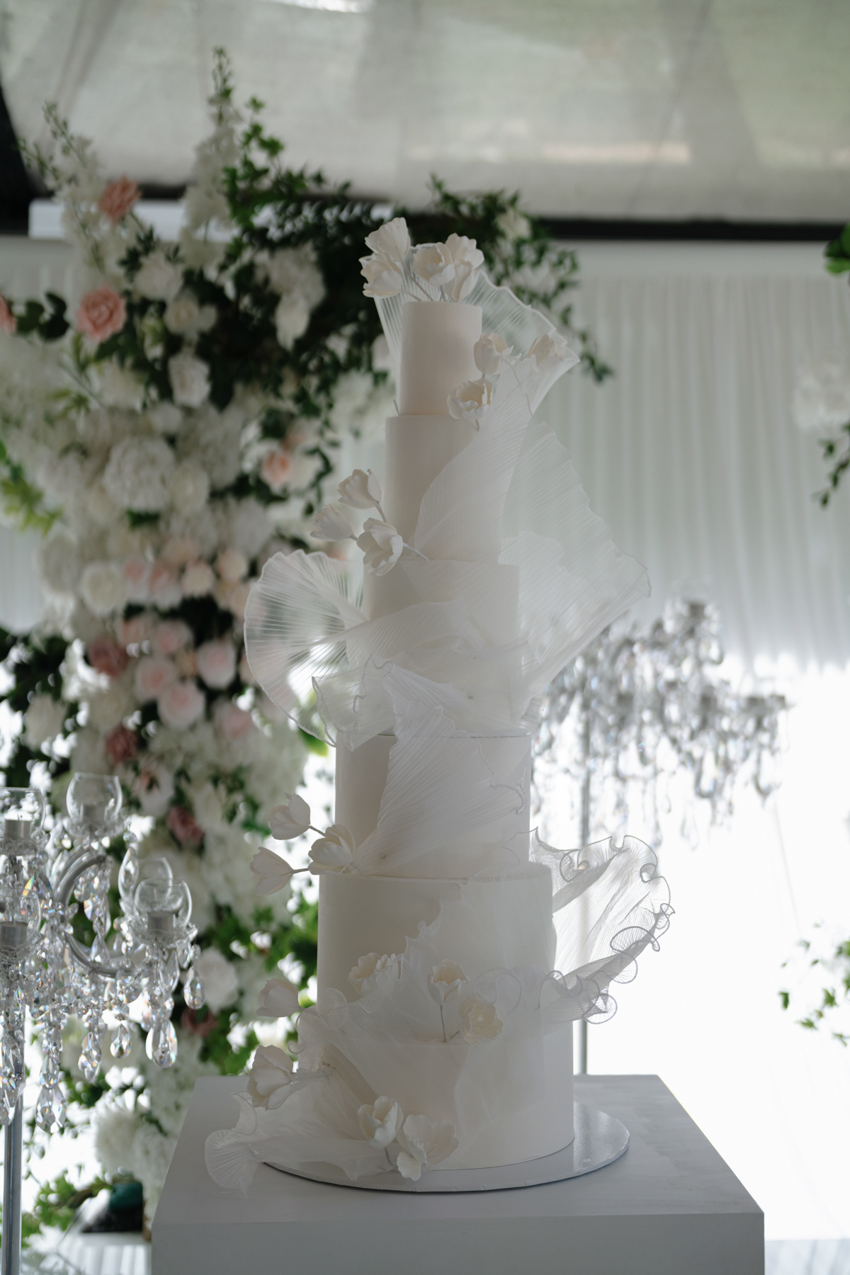 A wedding cake in six tiers is not something we see too often. Not too far from traditional, but much grander.